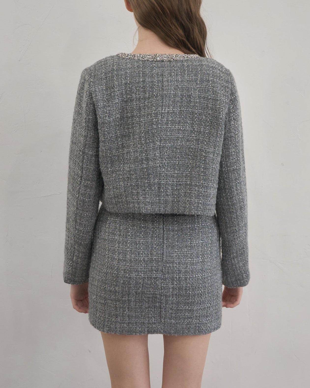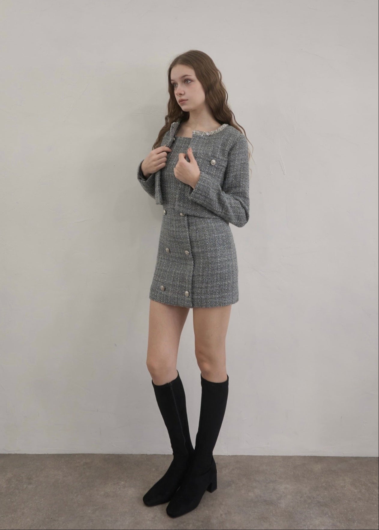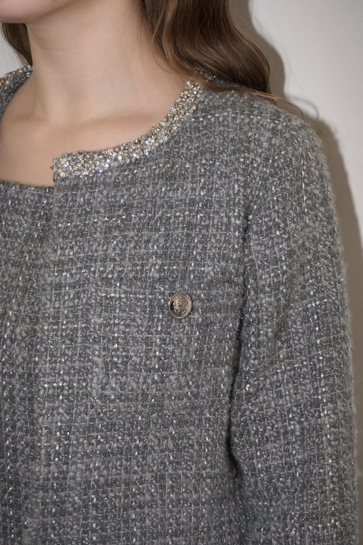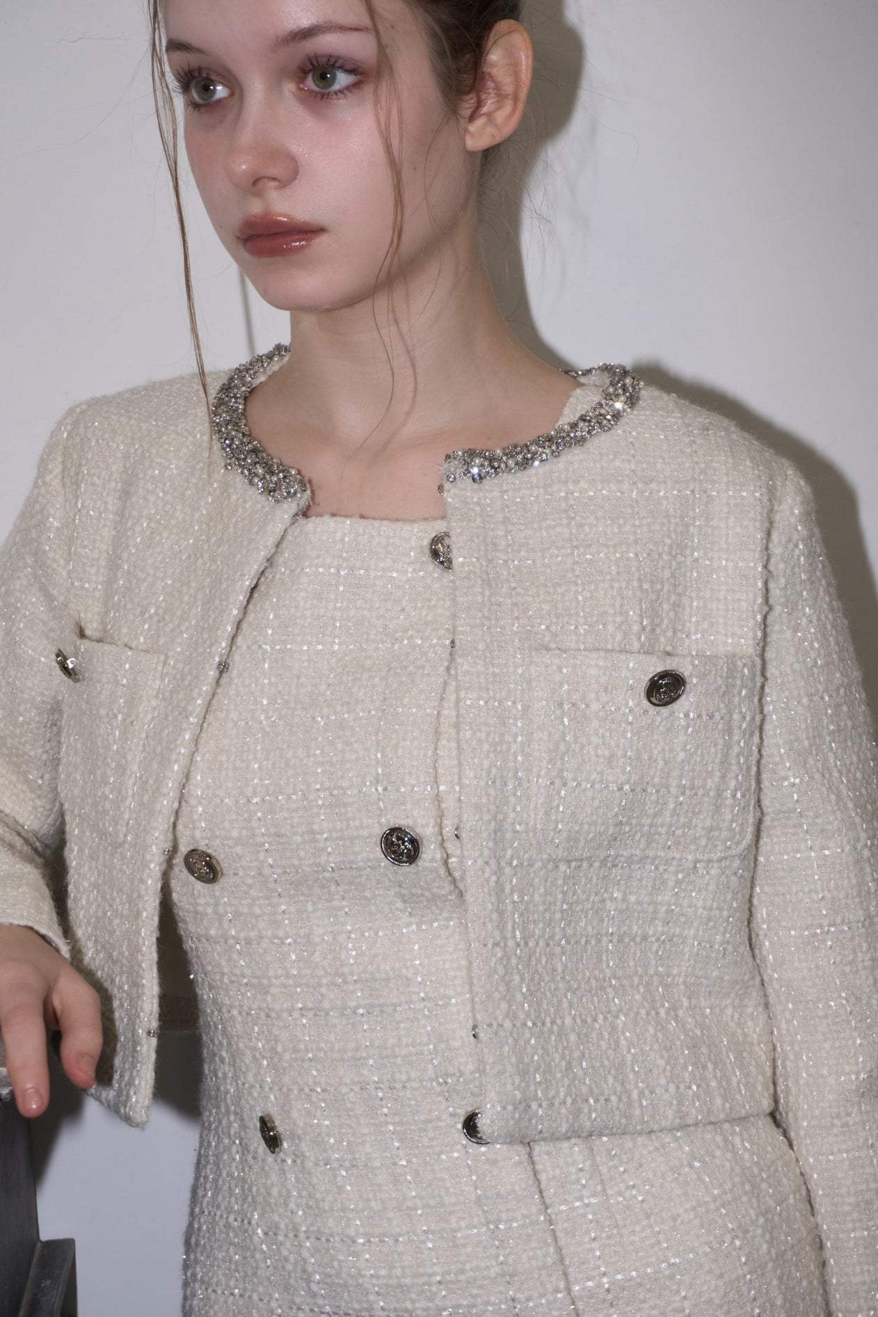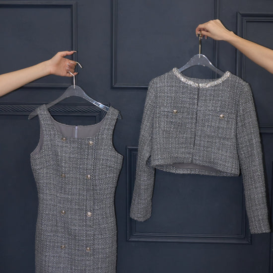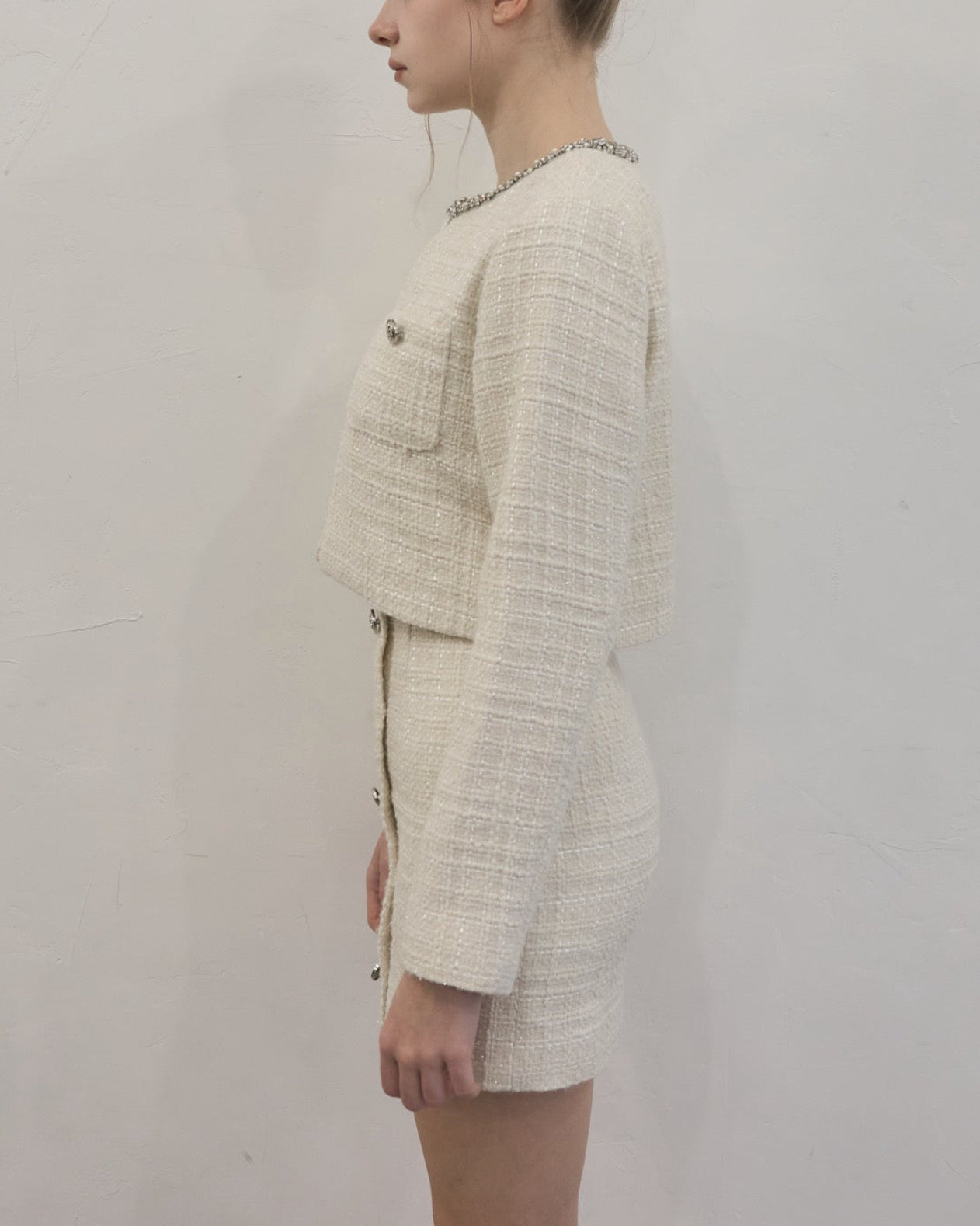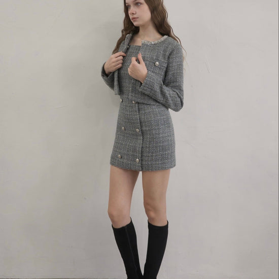 ツイード特有の立体的な織りにさりげないラメ感をプラスし、動くたびに上品な輝きを放ちます。