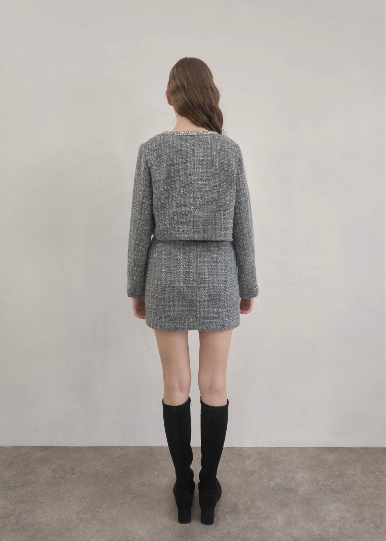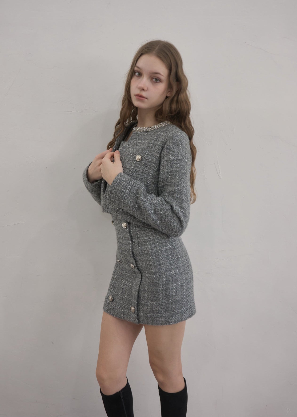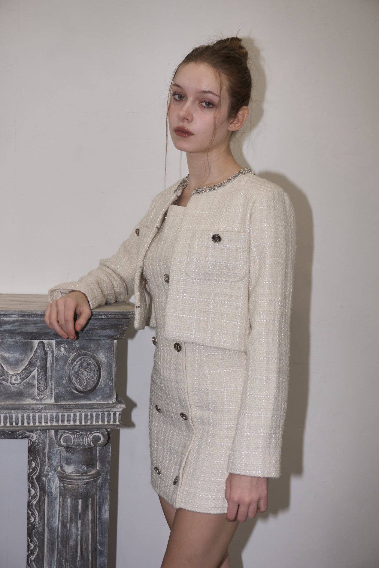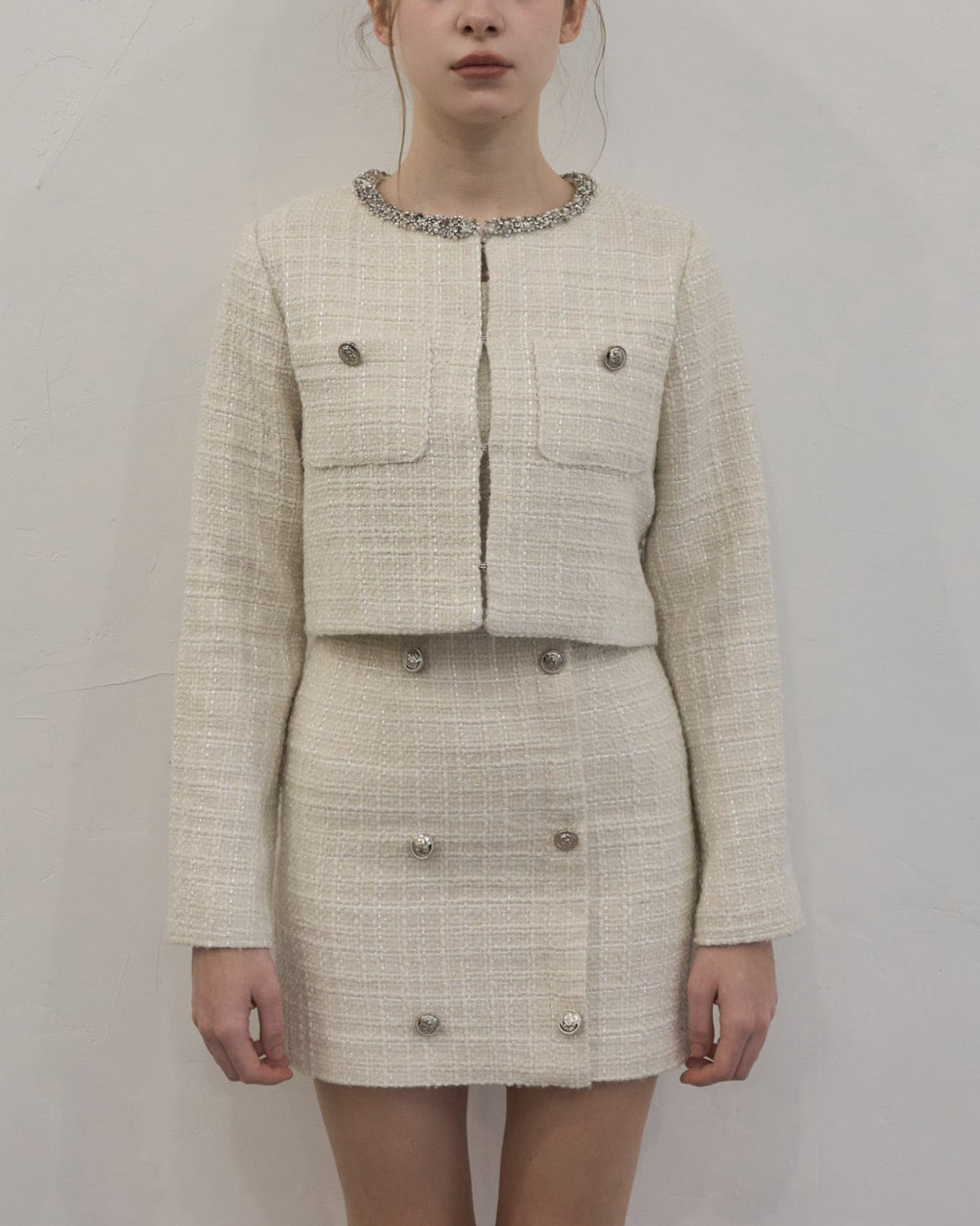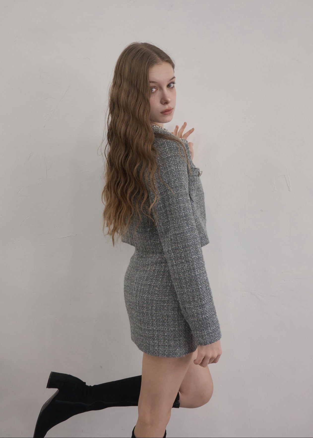 ツイード特有の立体的な織りにさりげないラメ感をプラスし、動くたびに上品な輝きを放ちます。