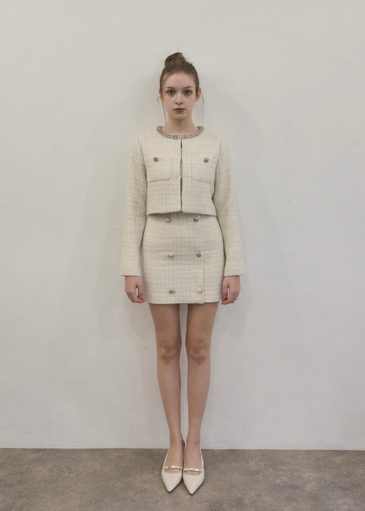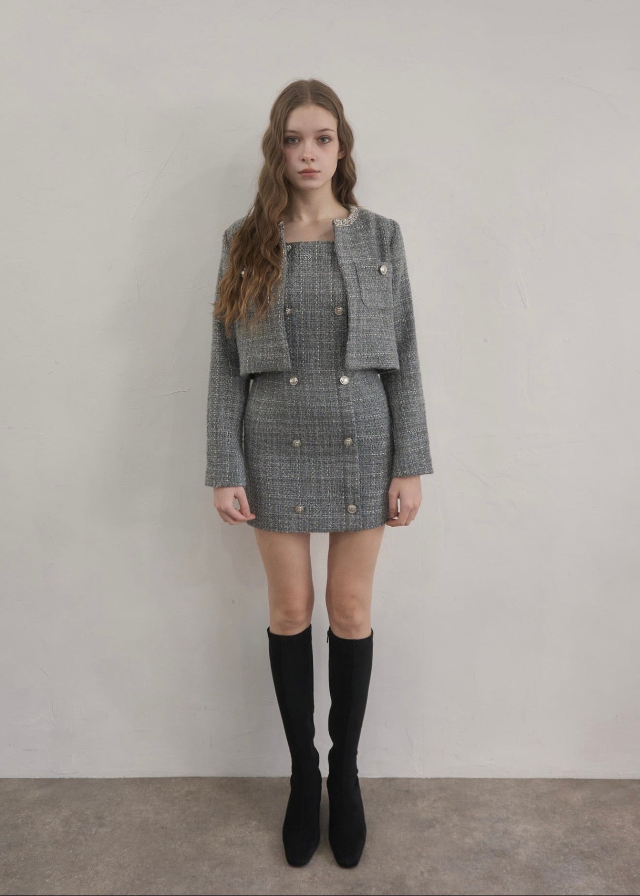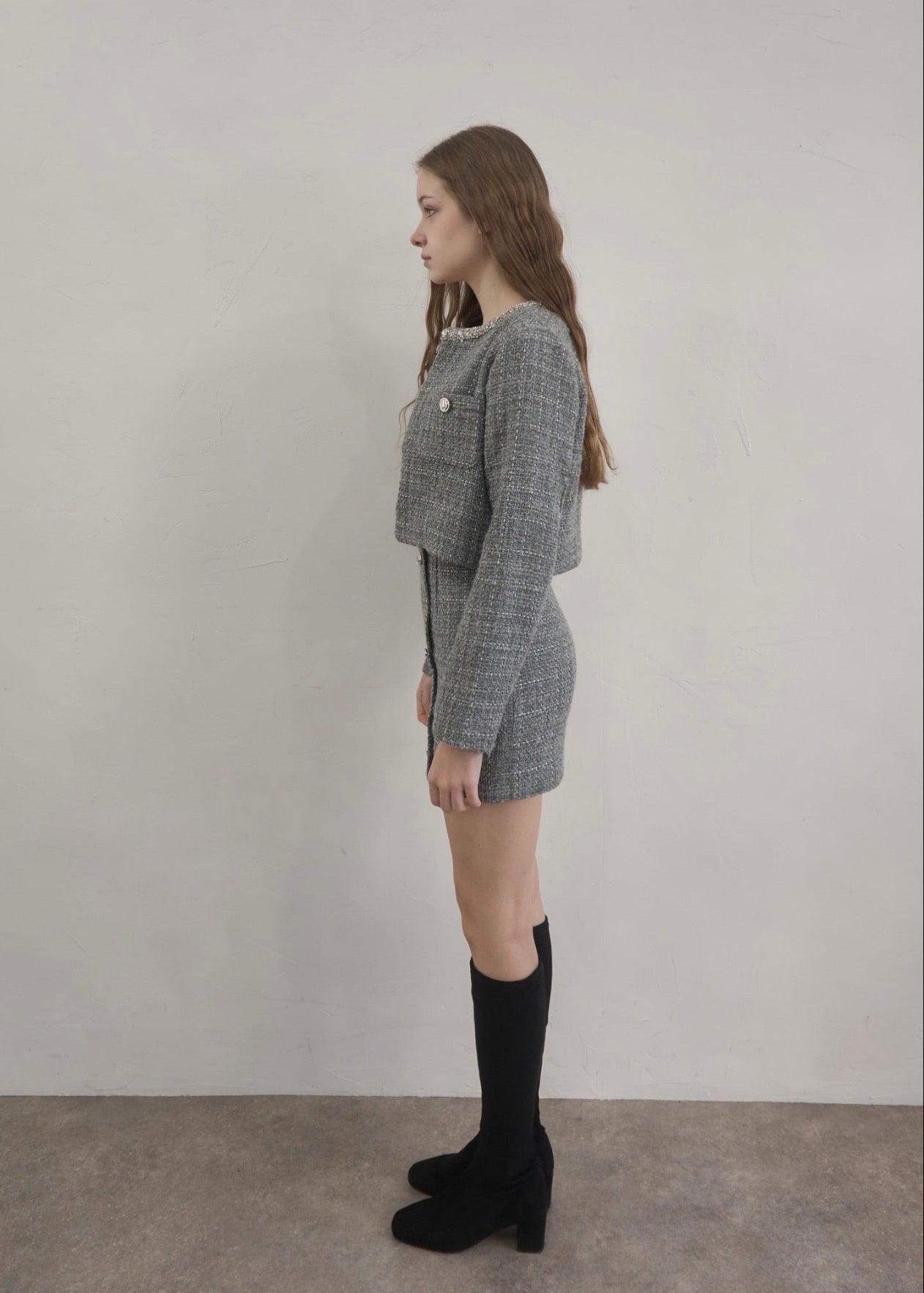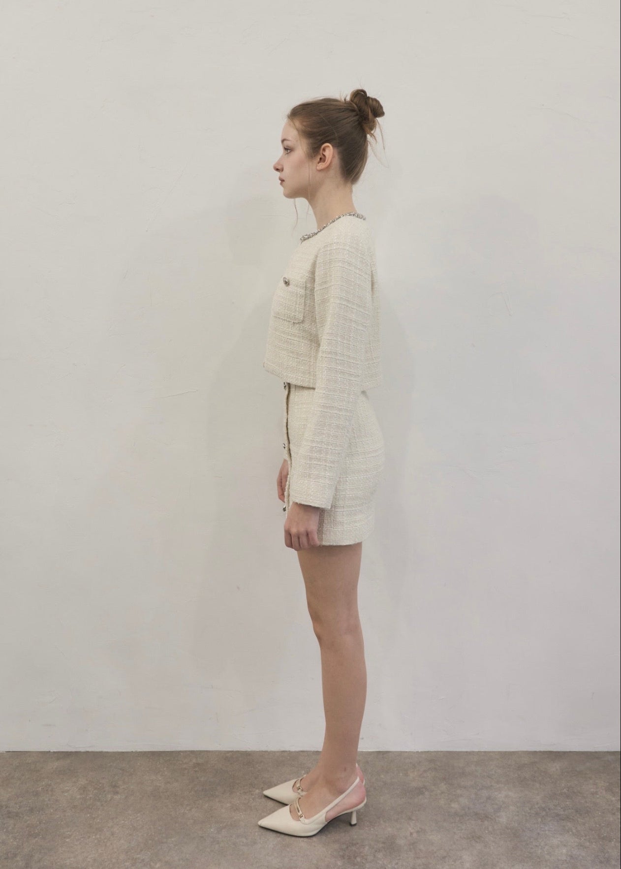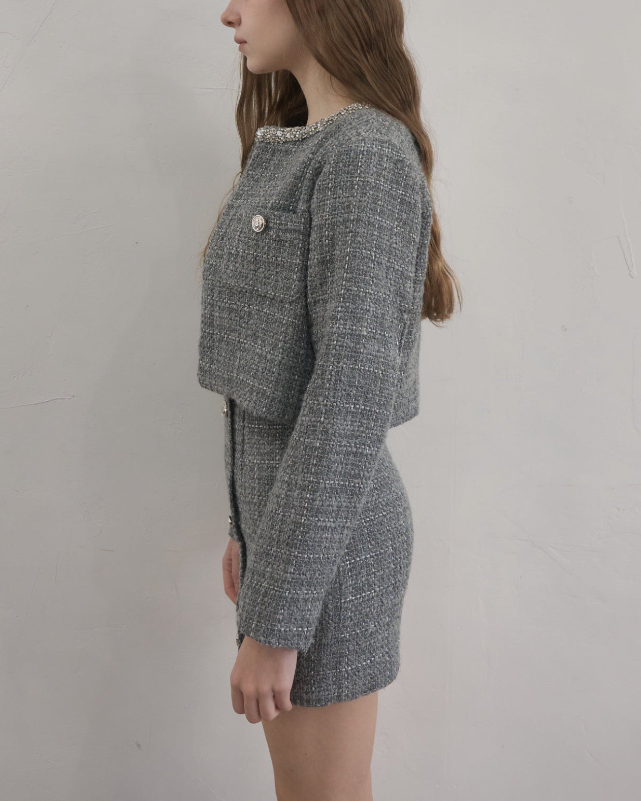 ツイード特有の立体的な織りにさりげないラメ感をプラスし、動くたびに上品な輝きを放ちます。