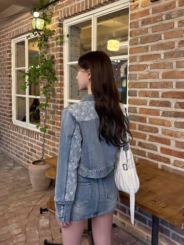 ブルーデニムにはホワイトのレースで、春らしく明るいフェミニンな印象。