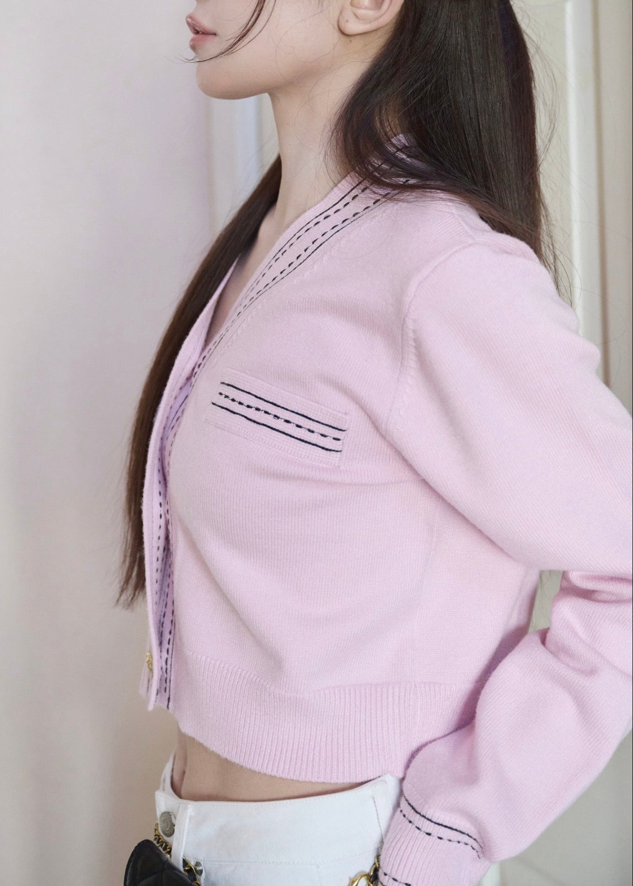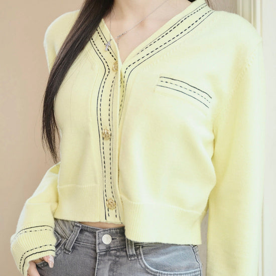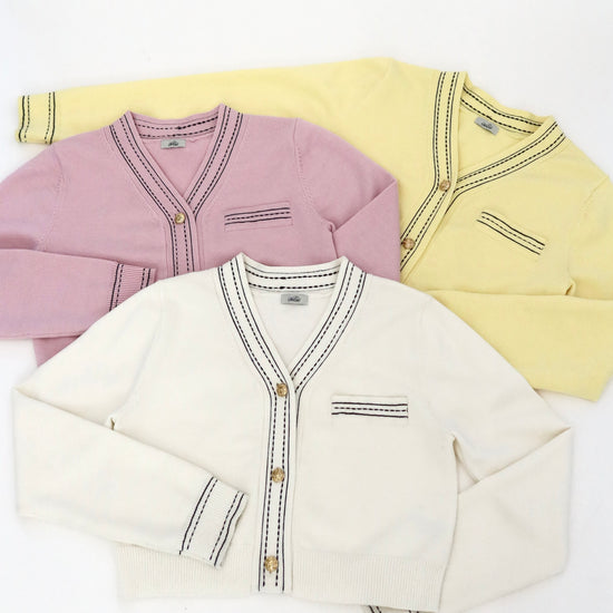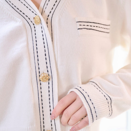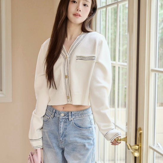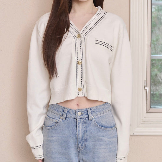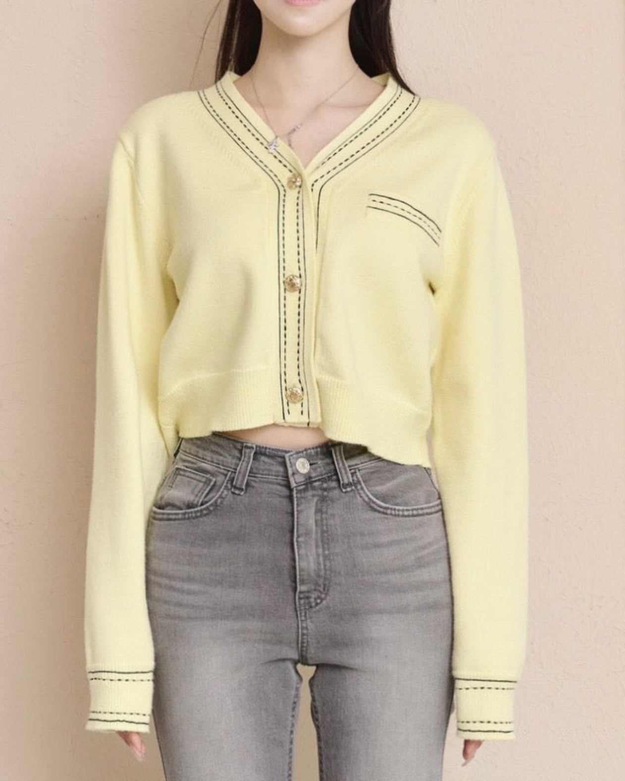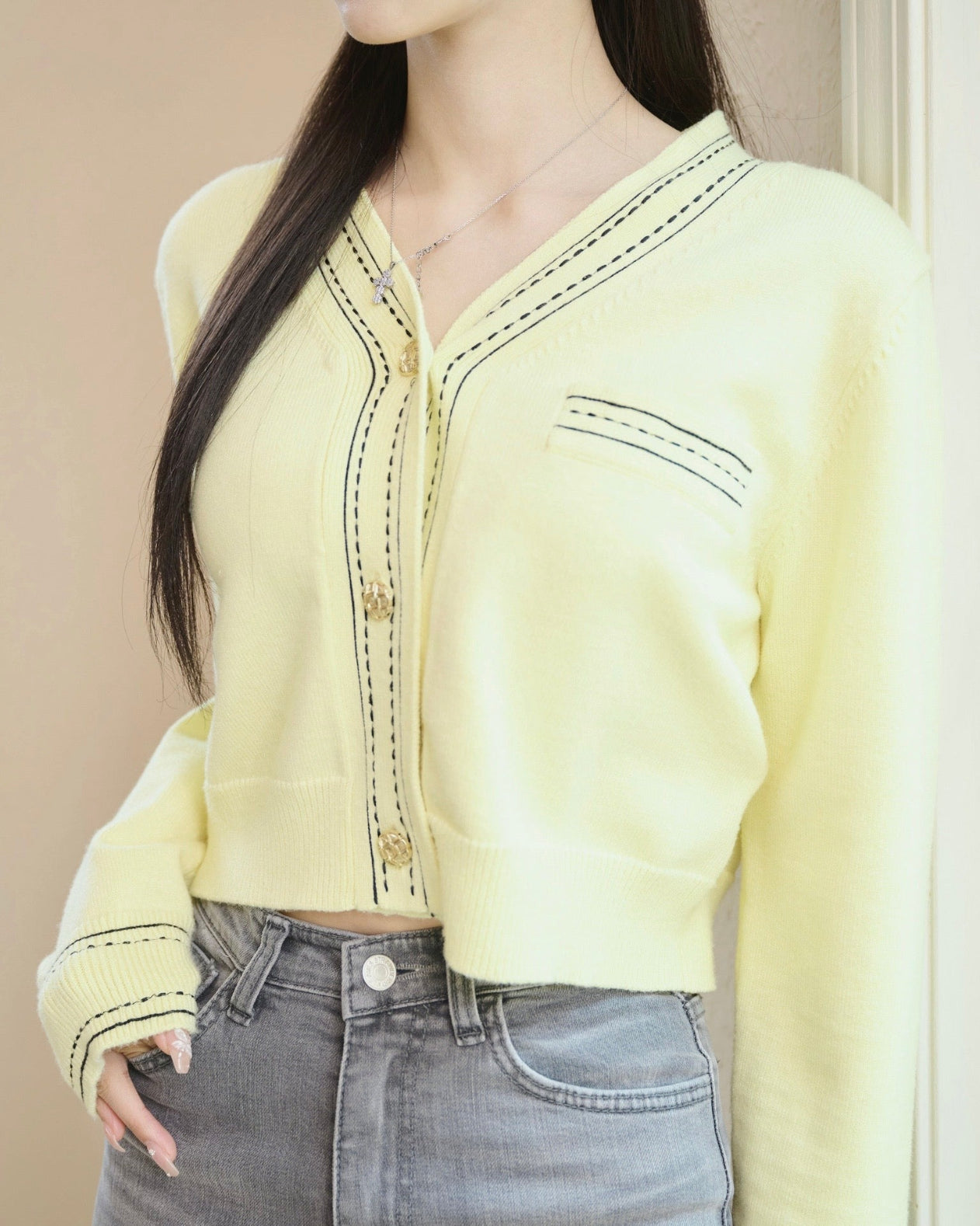 上品なゴールドボタンと繊細な配色ステッチが目を惹く、トレンド感のあるショート丈カーディガン。