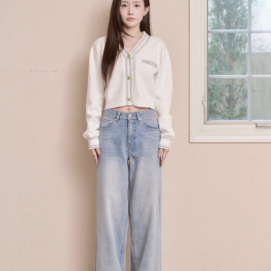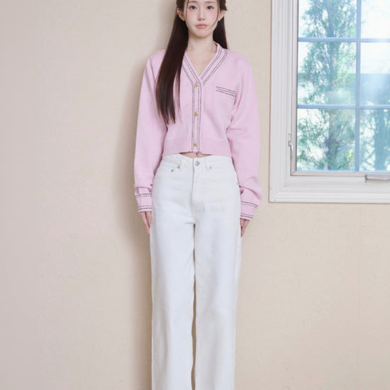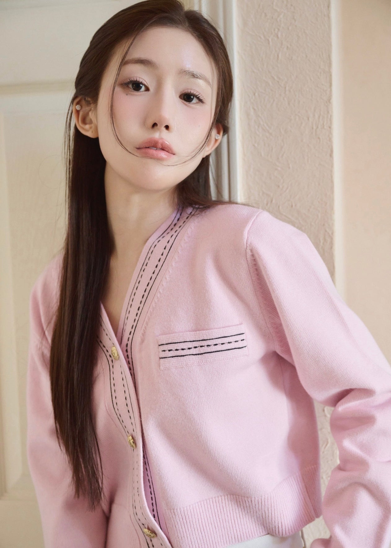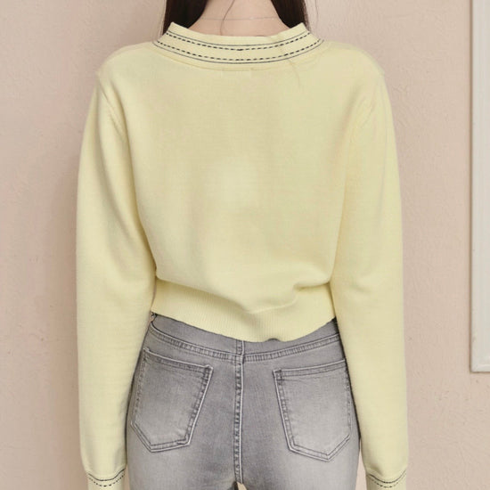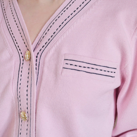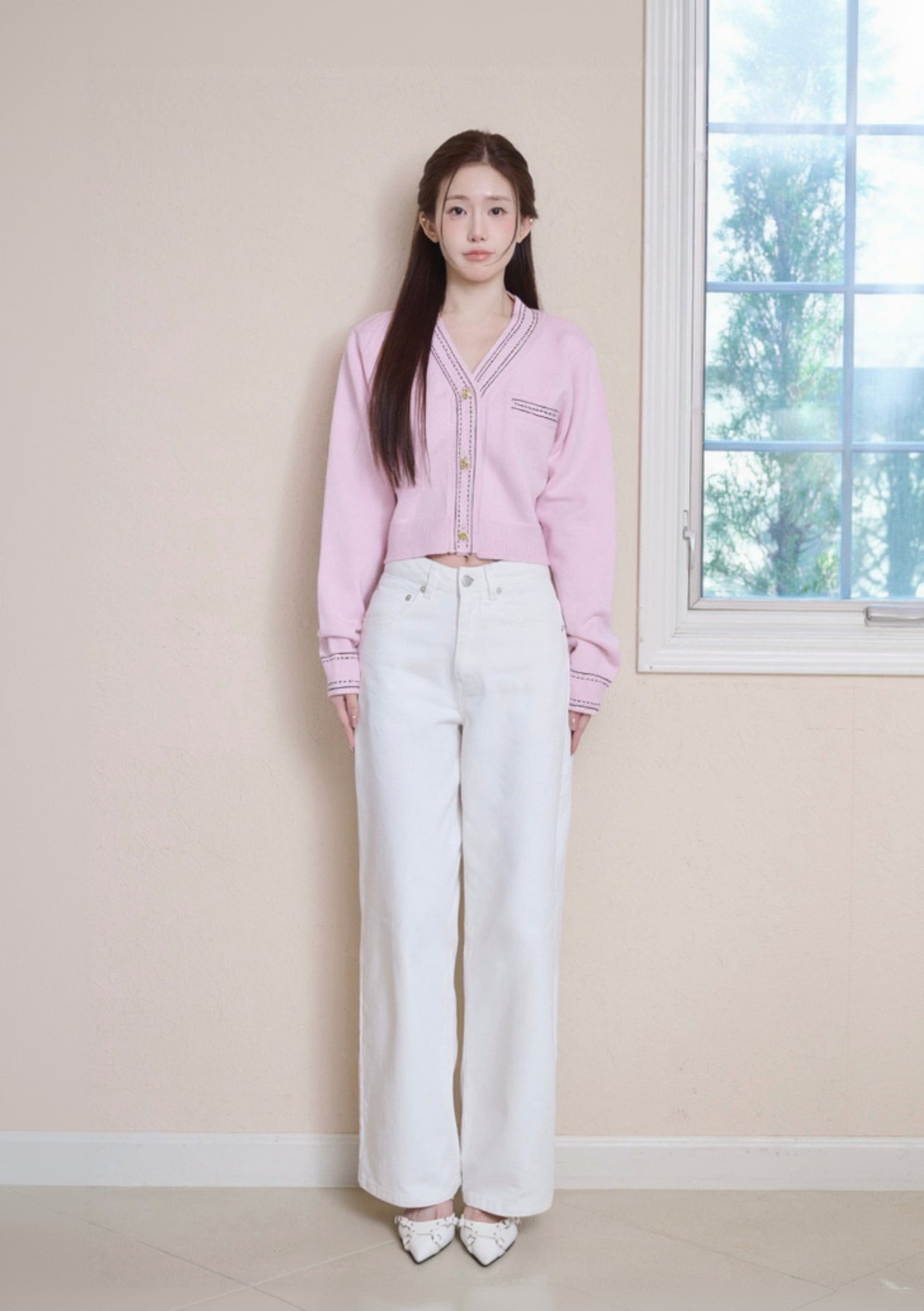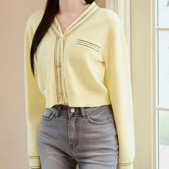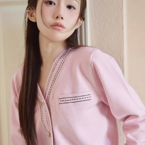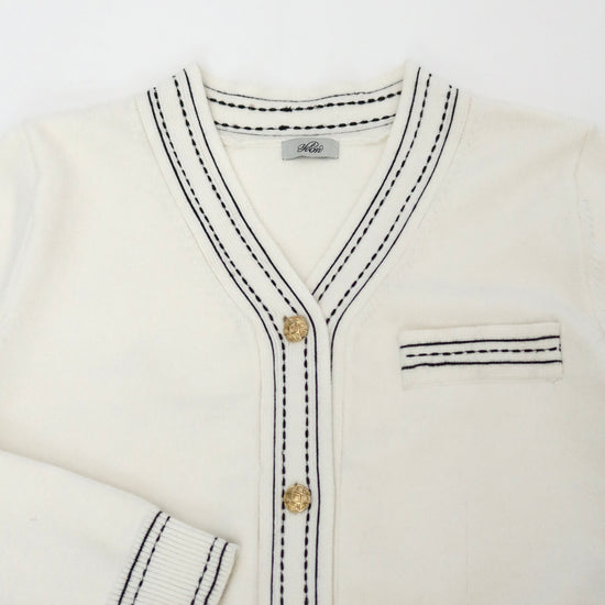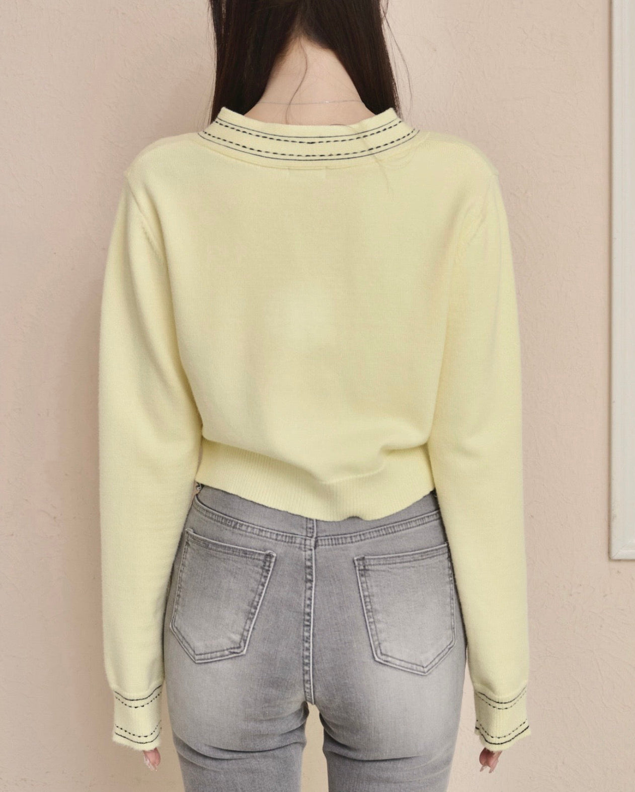 上品なゴールドボタンと繊細な配色ステッチが目を惹く、トレンド感のあるショート丈カーディガン。