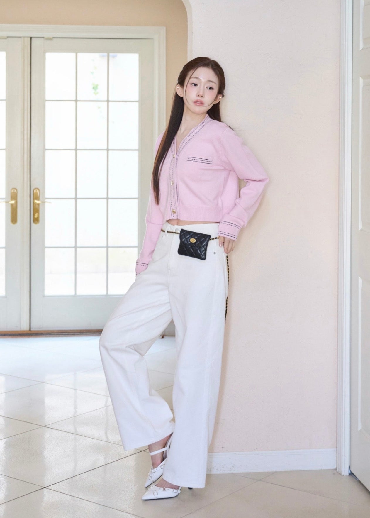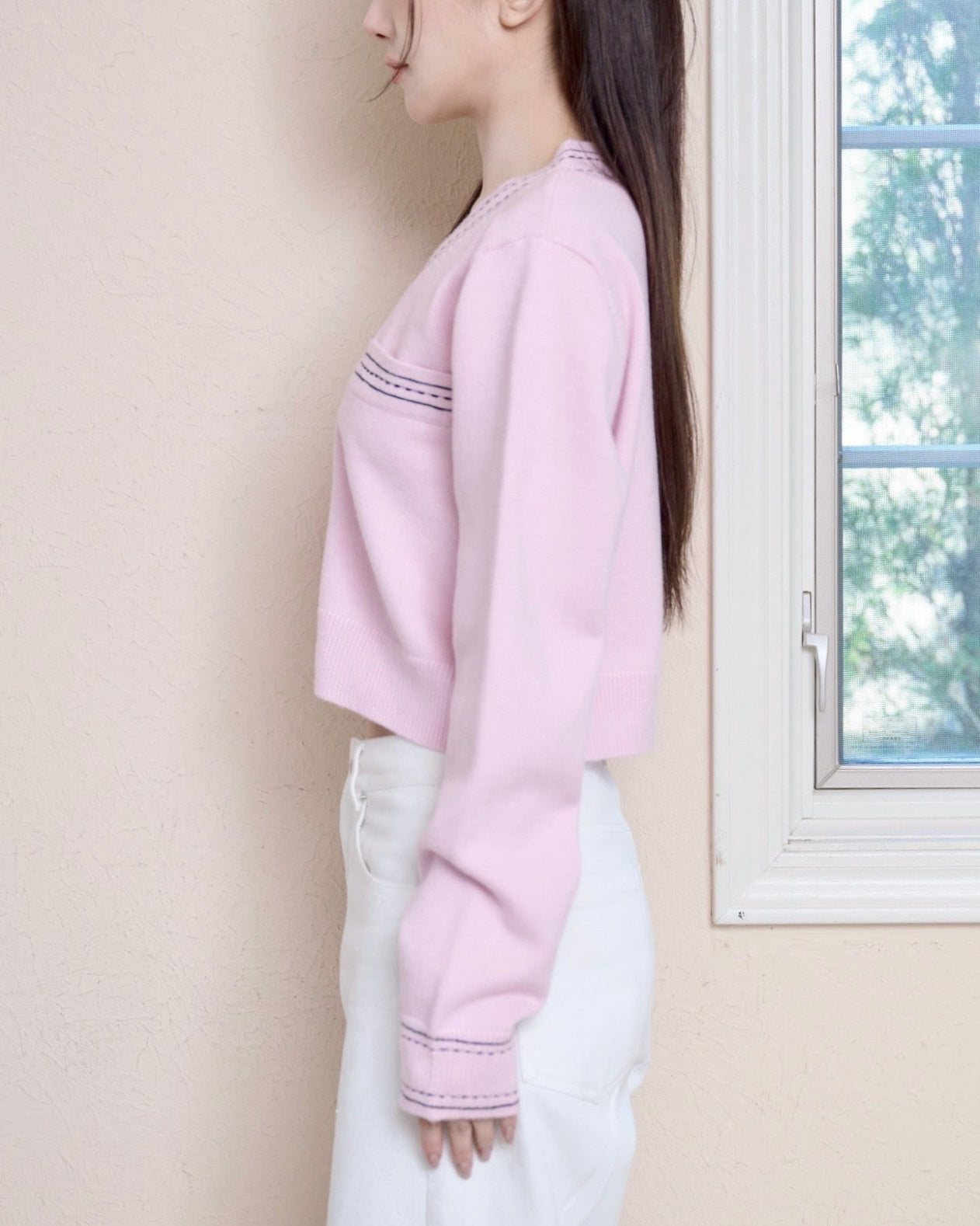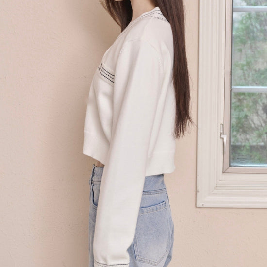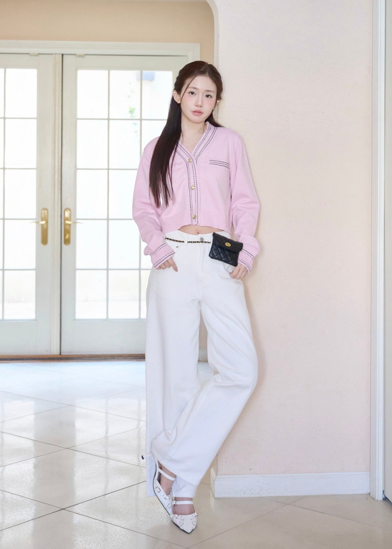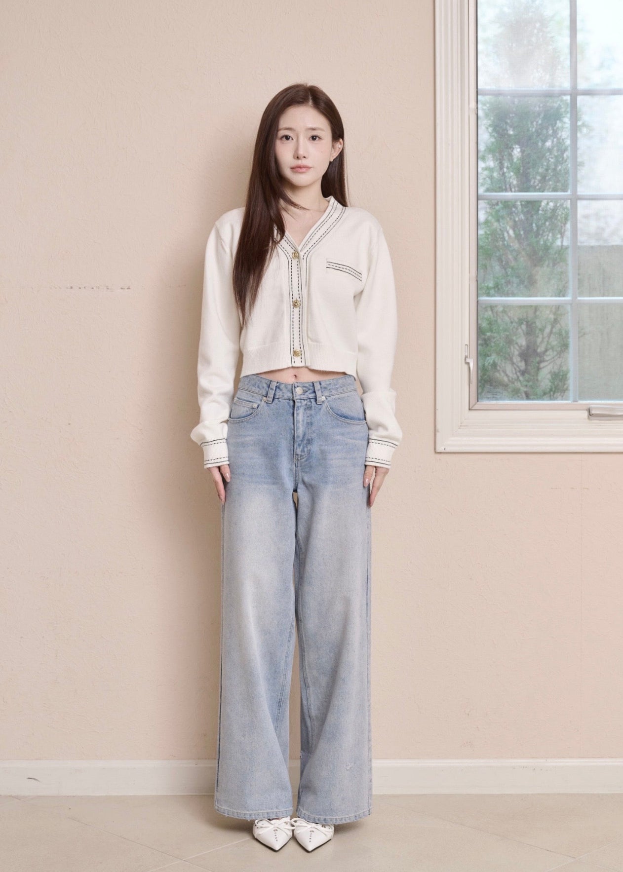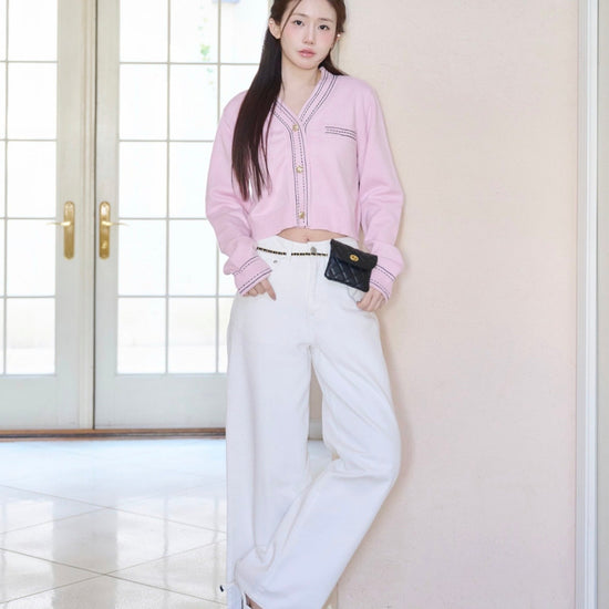 上品なゴールドボタンと繊細な配色ステッチが目を惹く、トレンド感のあるショート丈カーディガン。