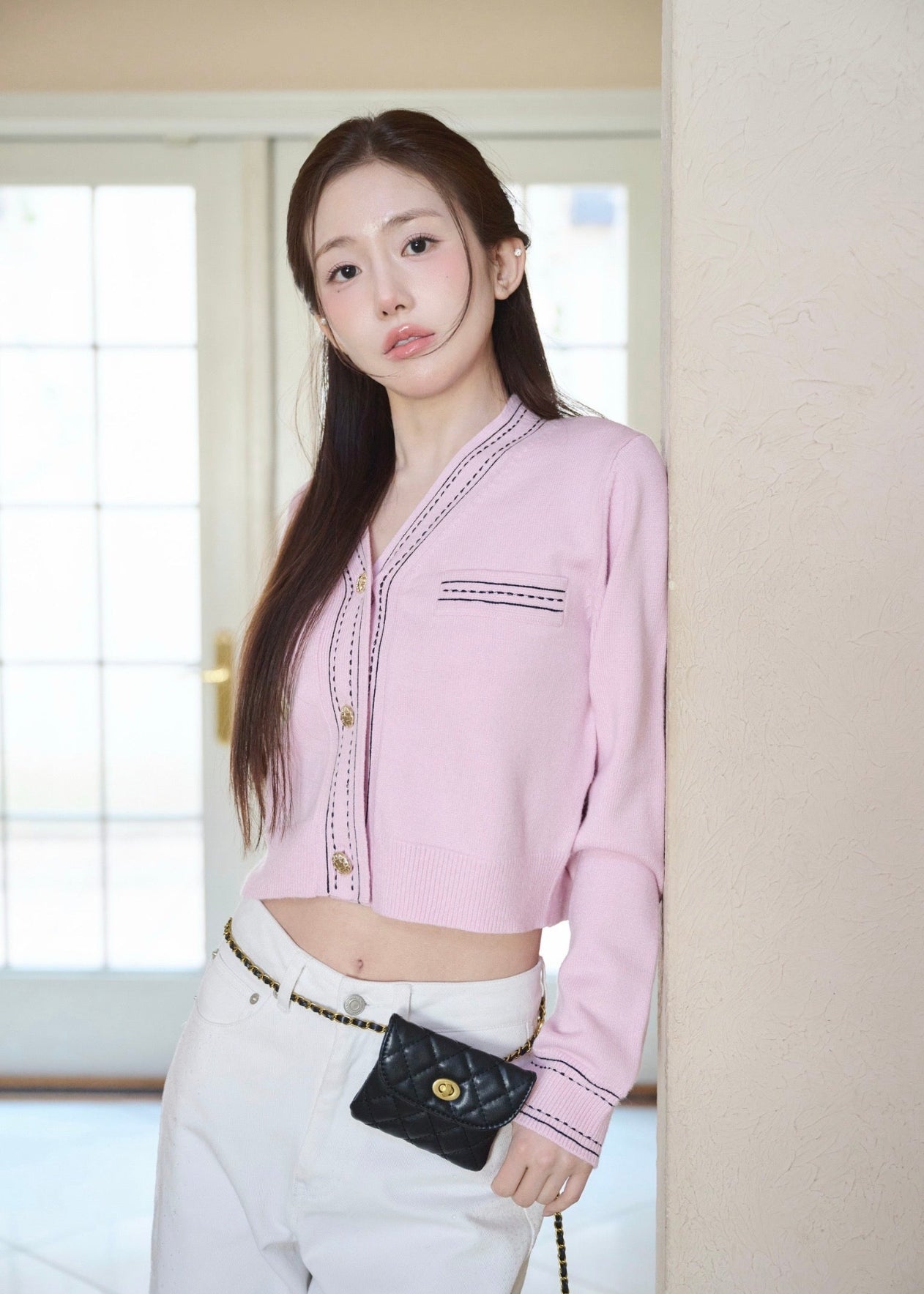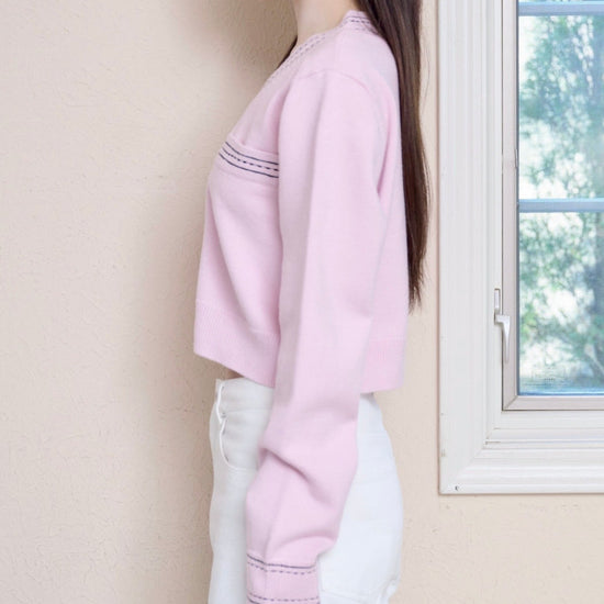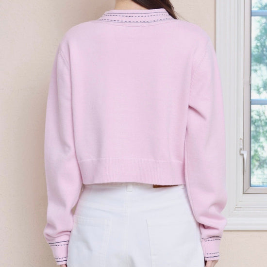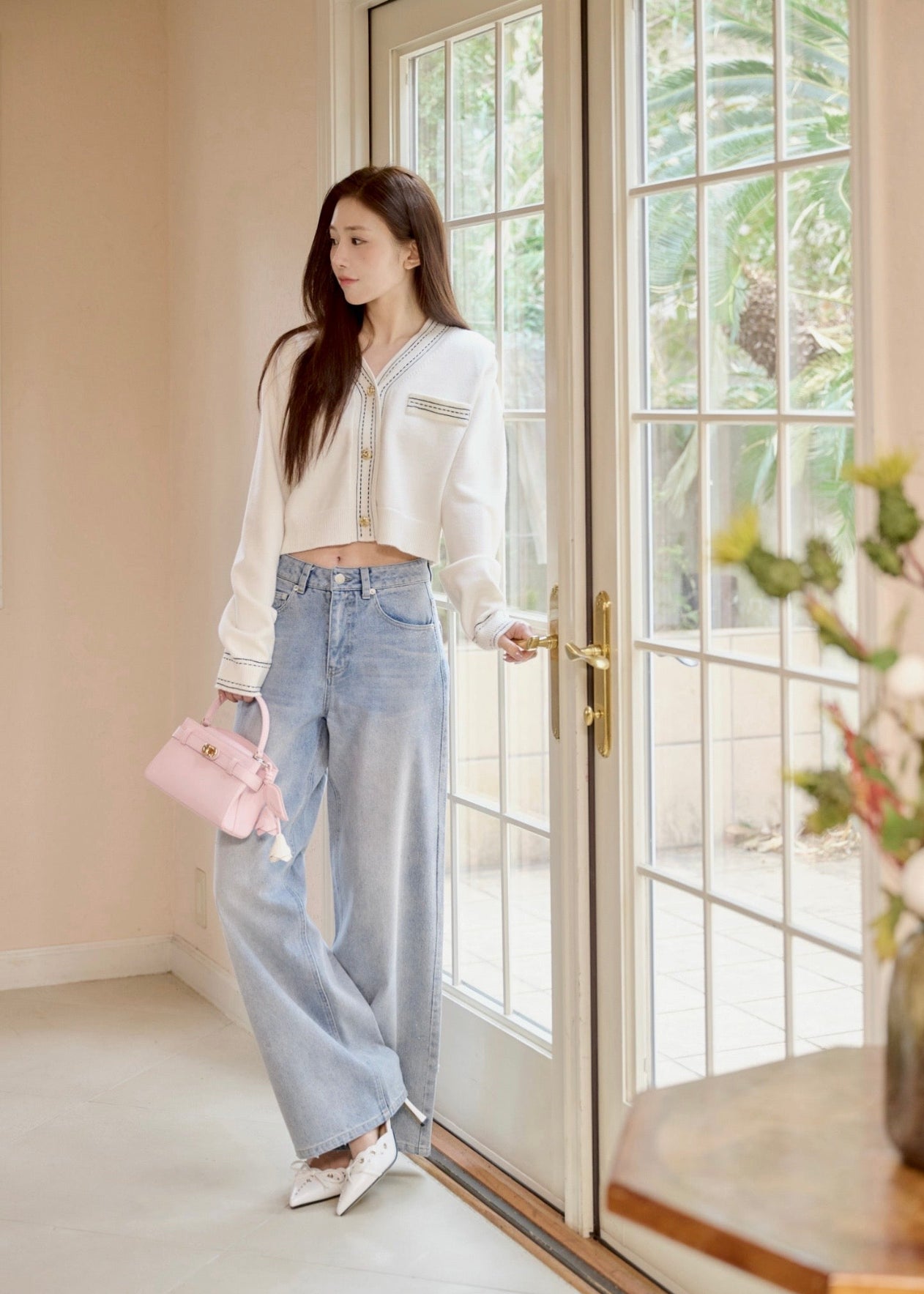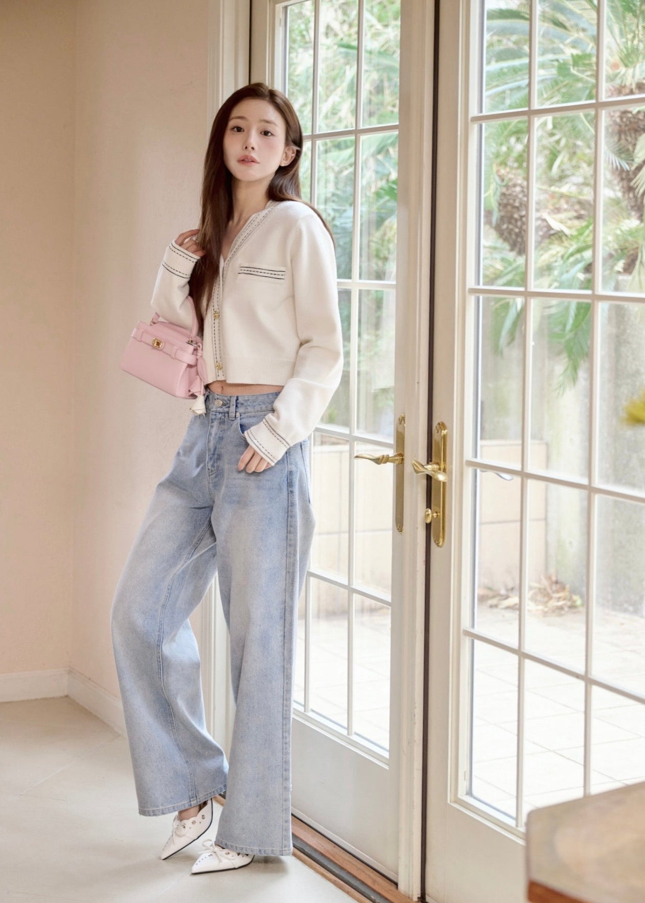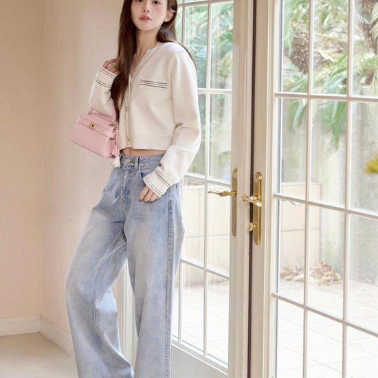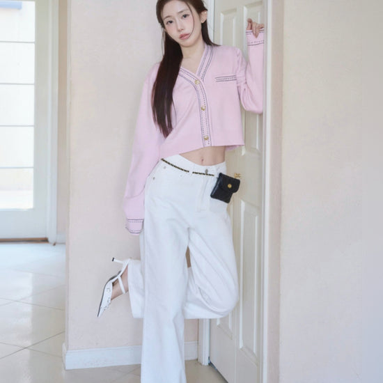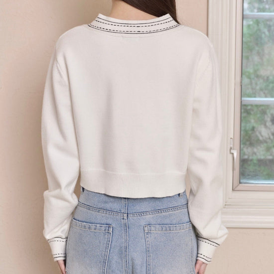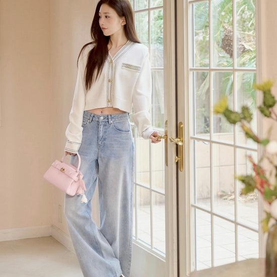上品なゴールドボタンと繊細な配色ステッチが目を惹く、トレンド感のあるショート丈カーディガン。