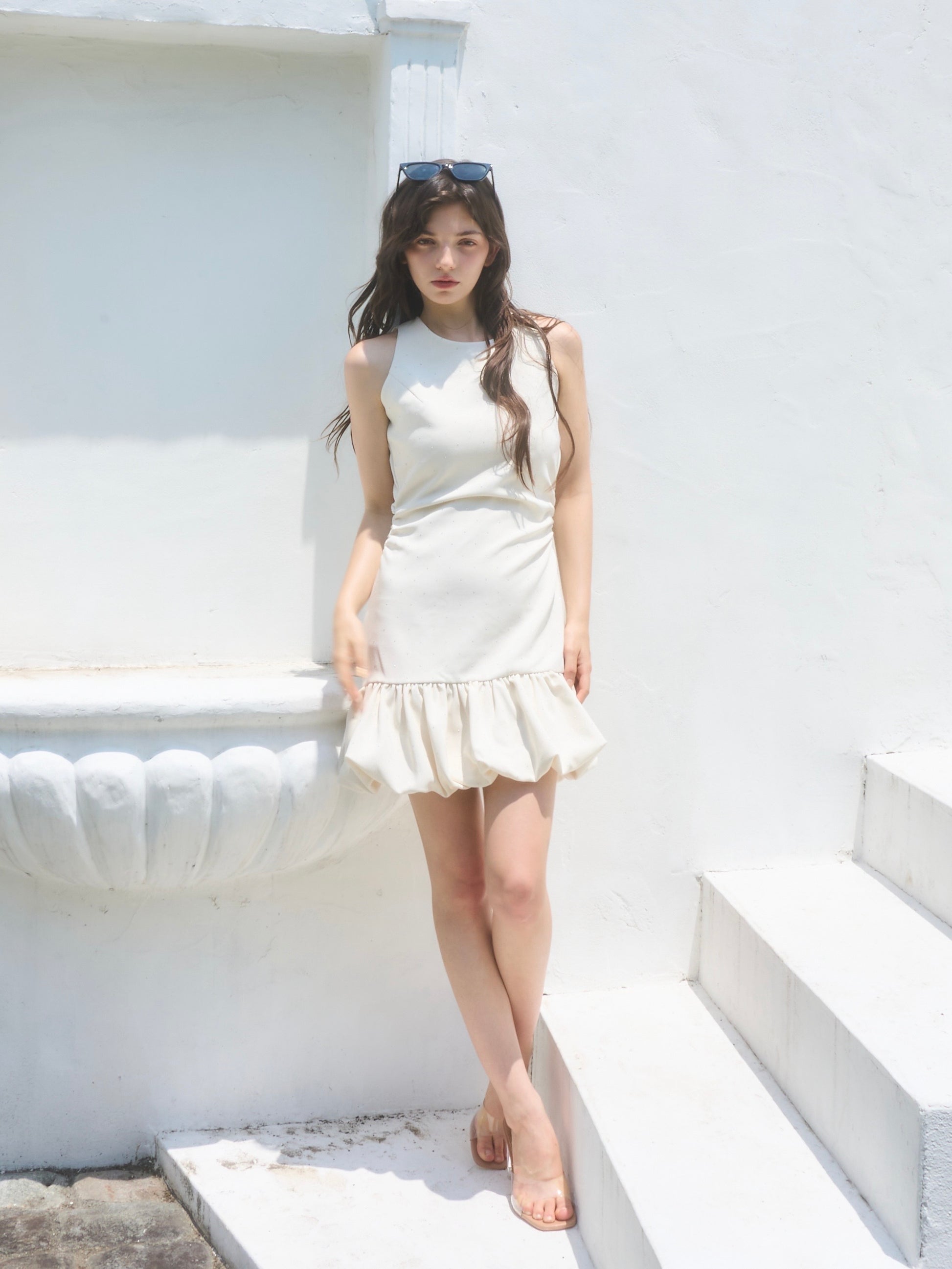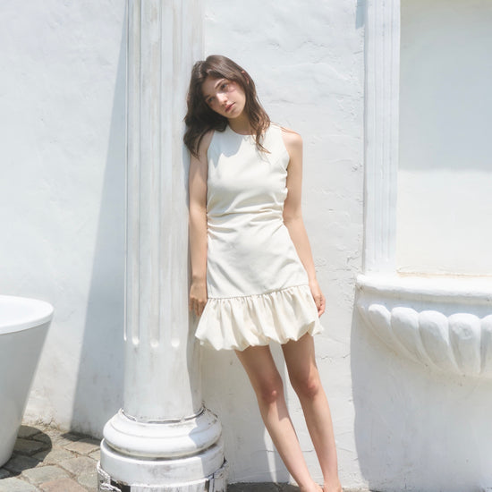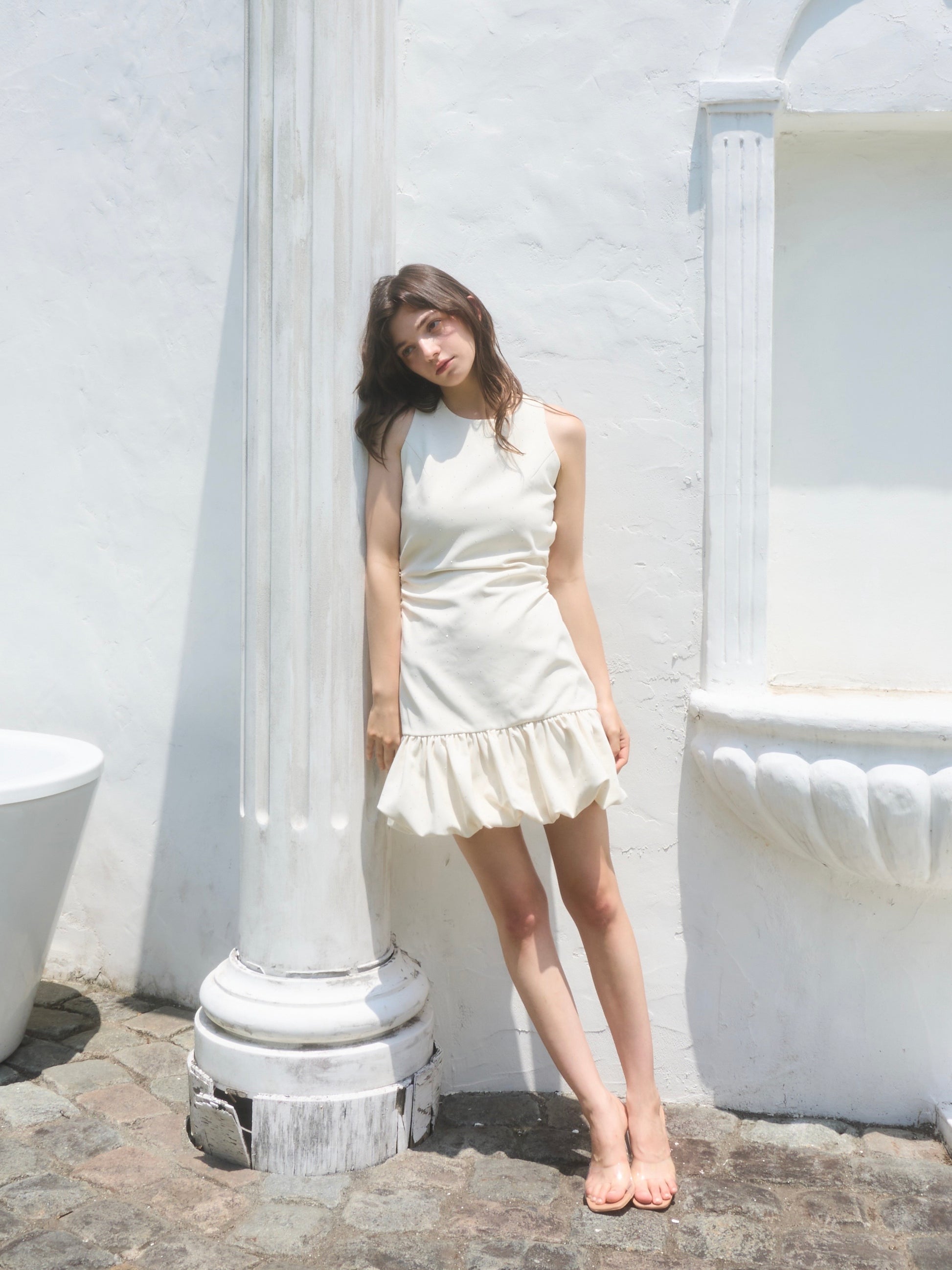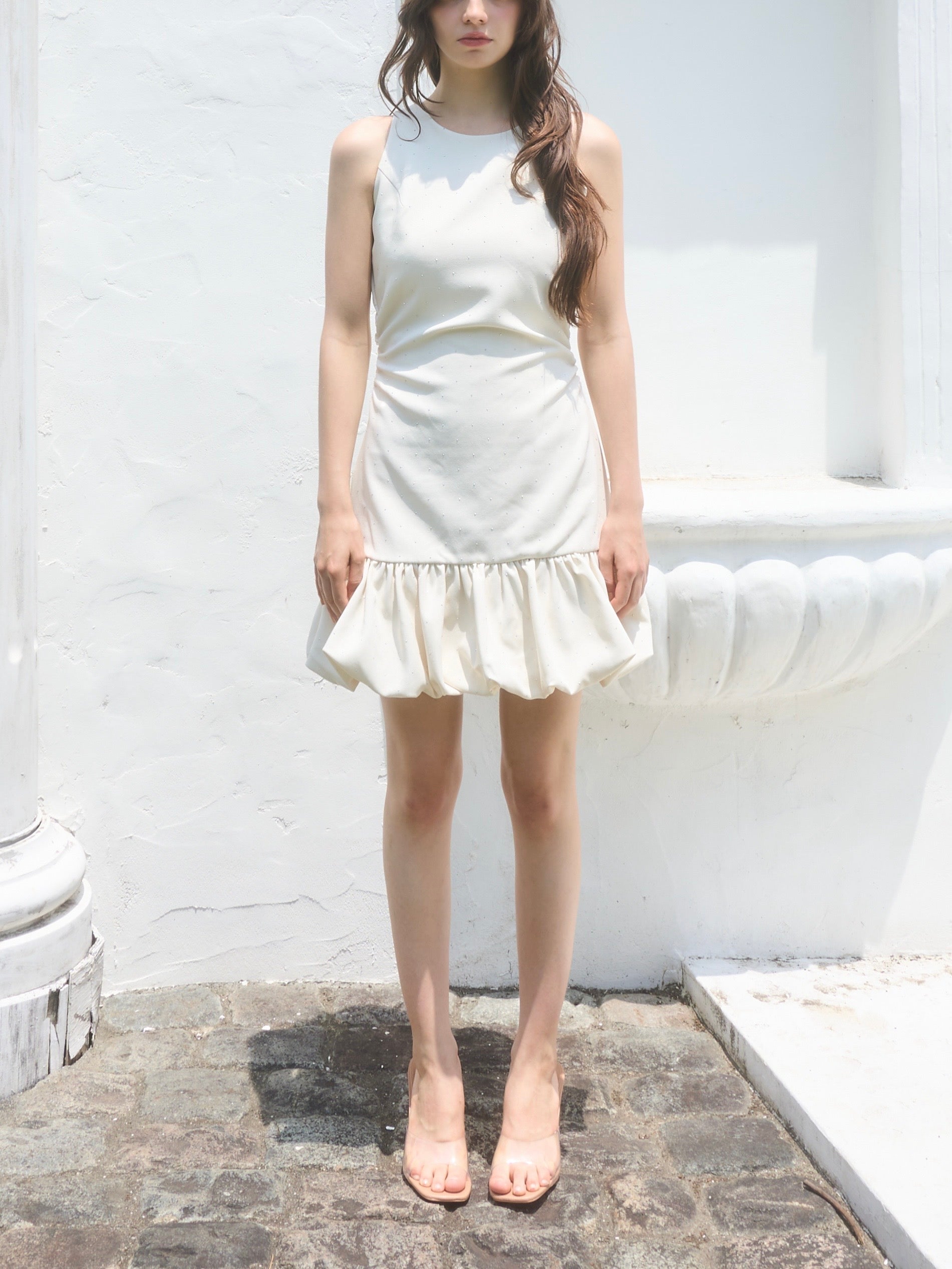 特徴的なバルーンシルエットが目を引く華やかなミニワンピース。