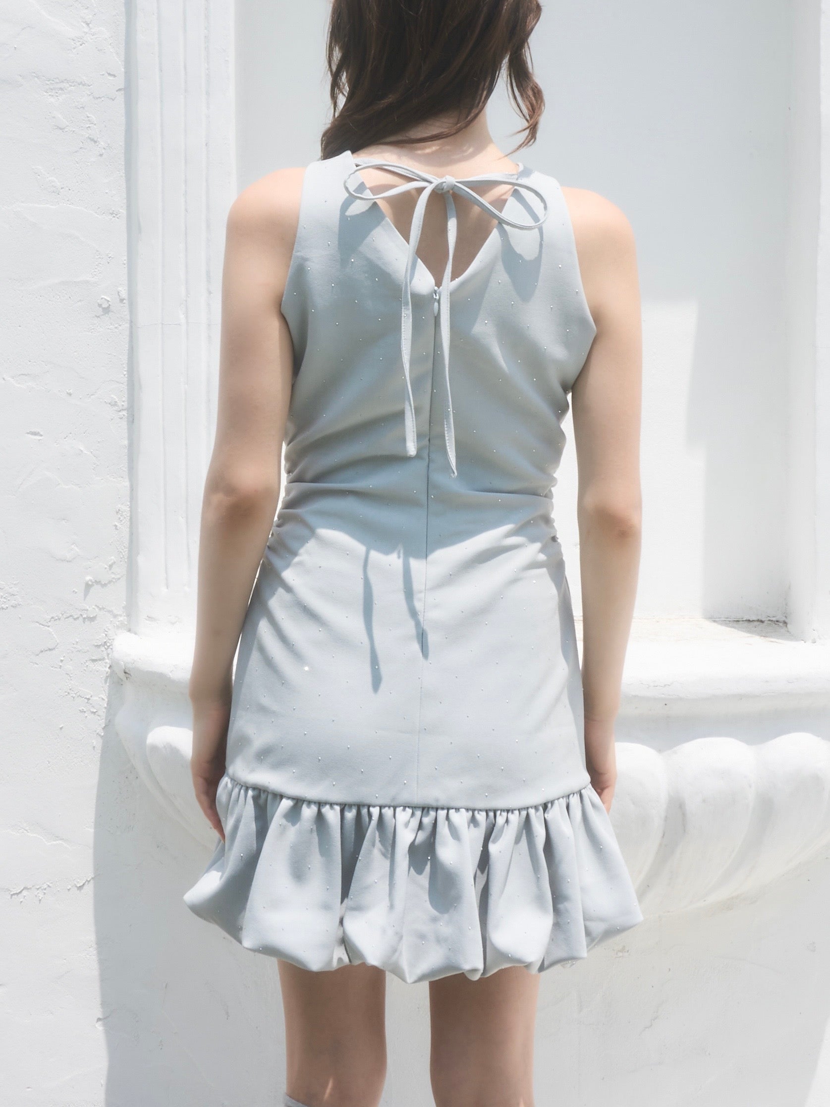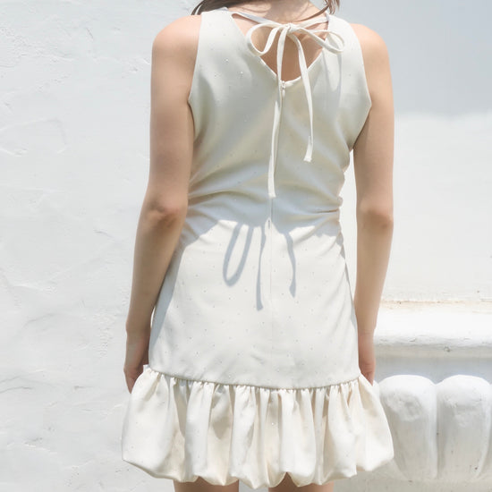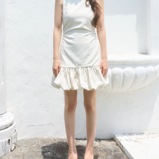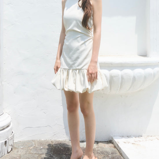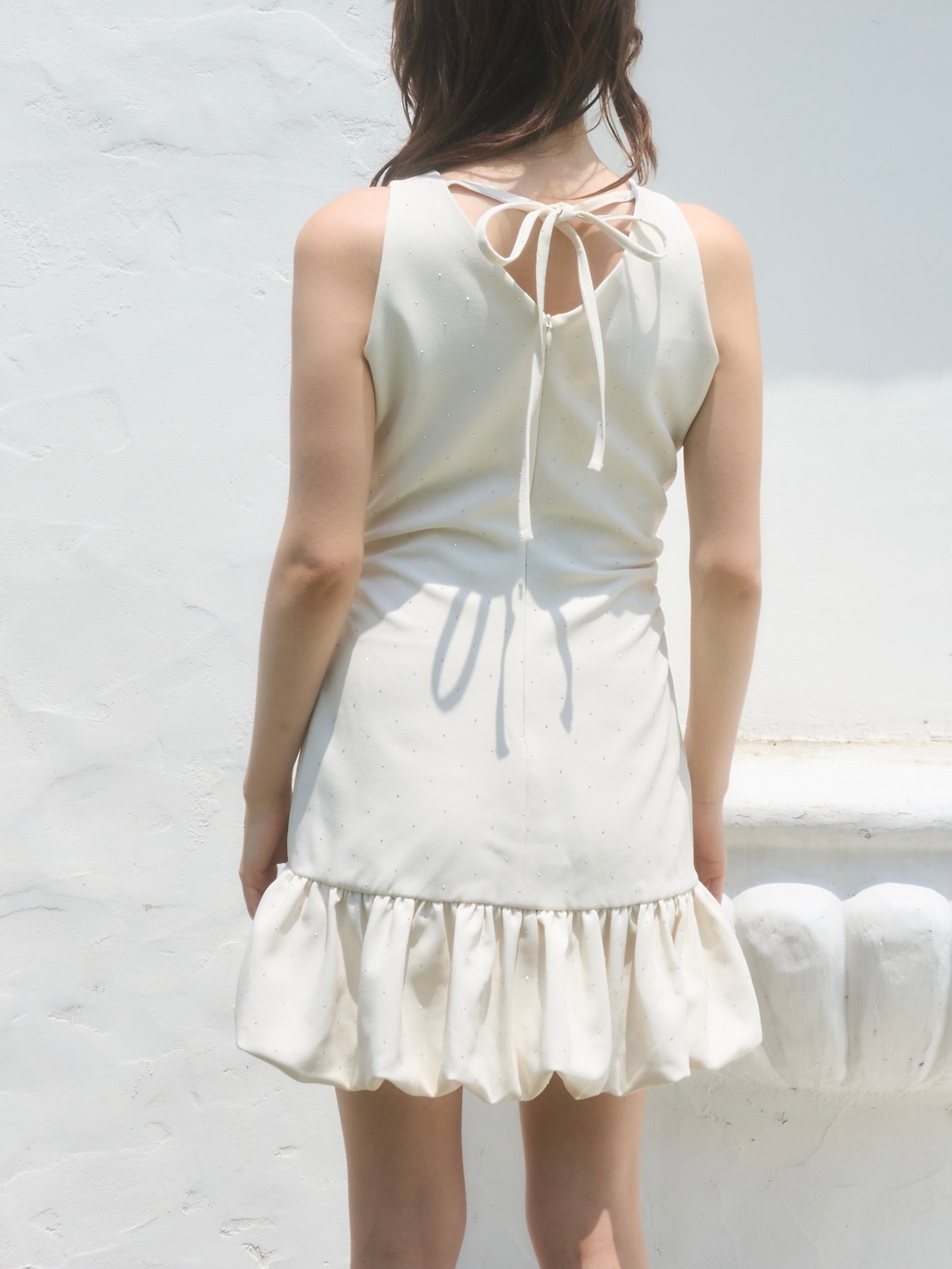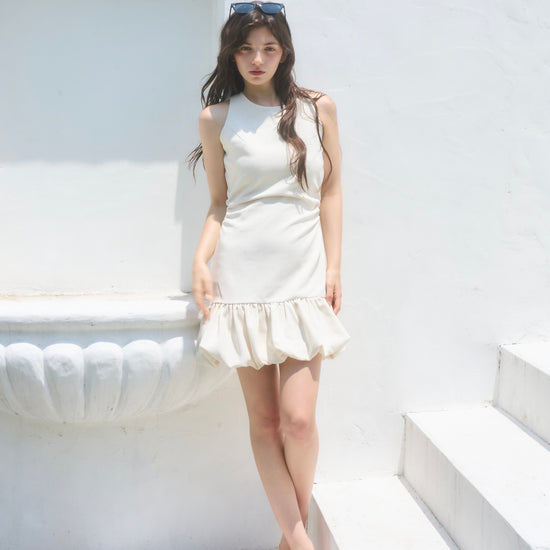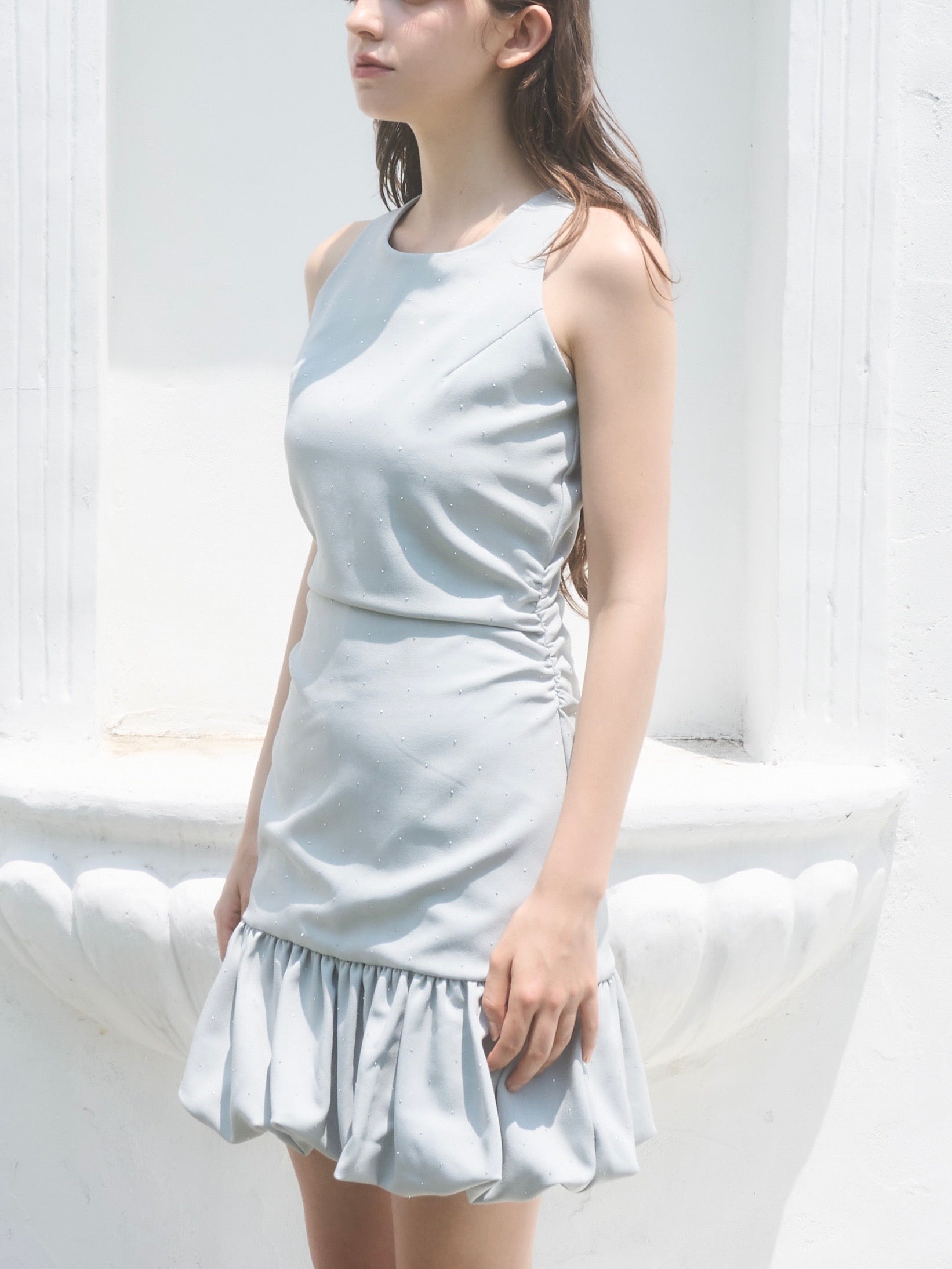 特徴的なバルーンシルエットが目を引く華やかなミニワンピース。