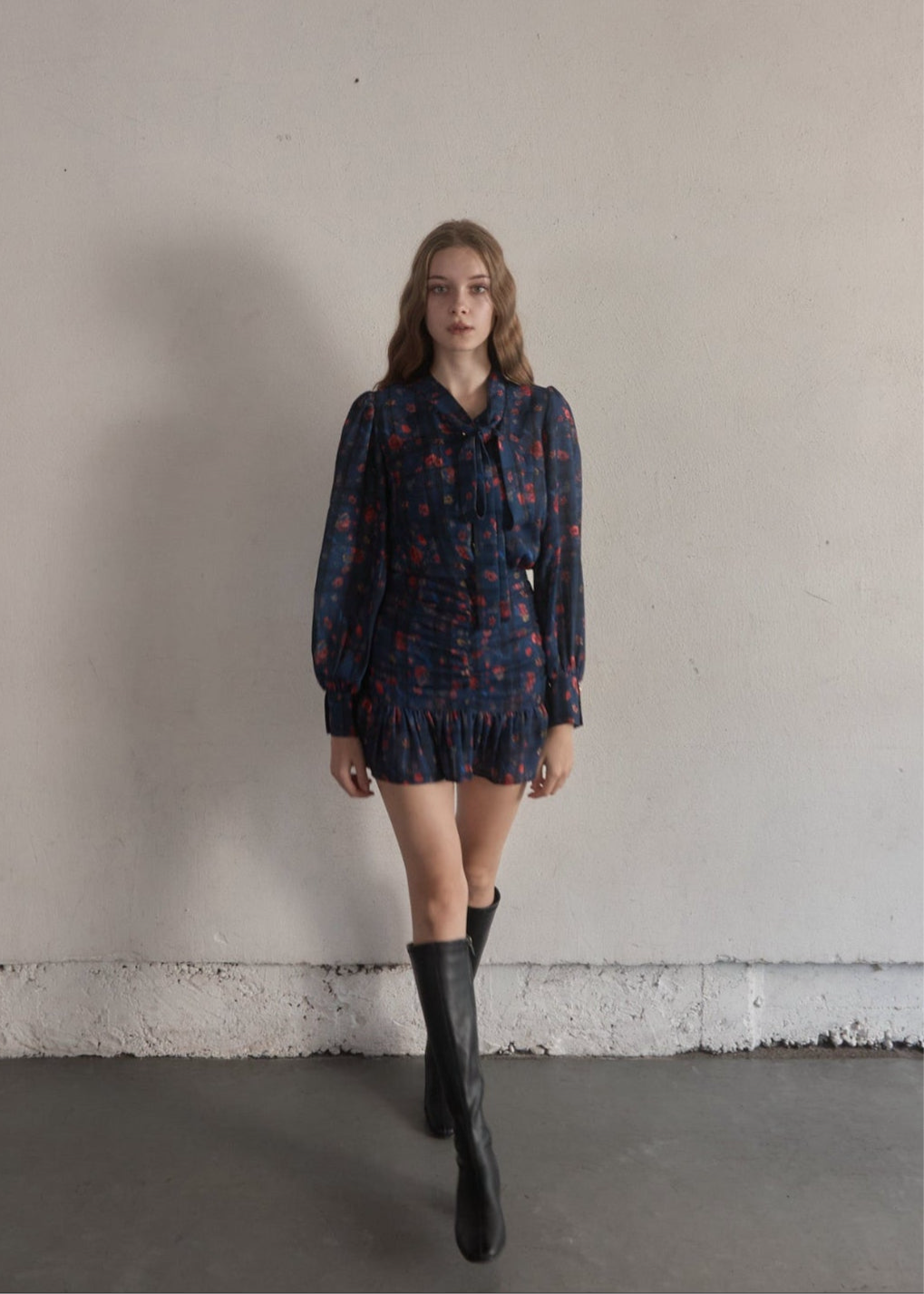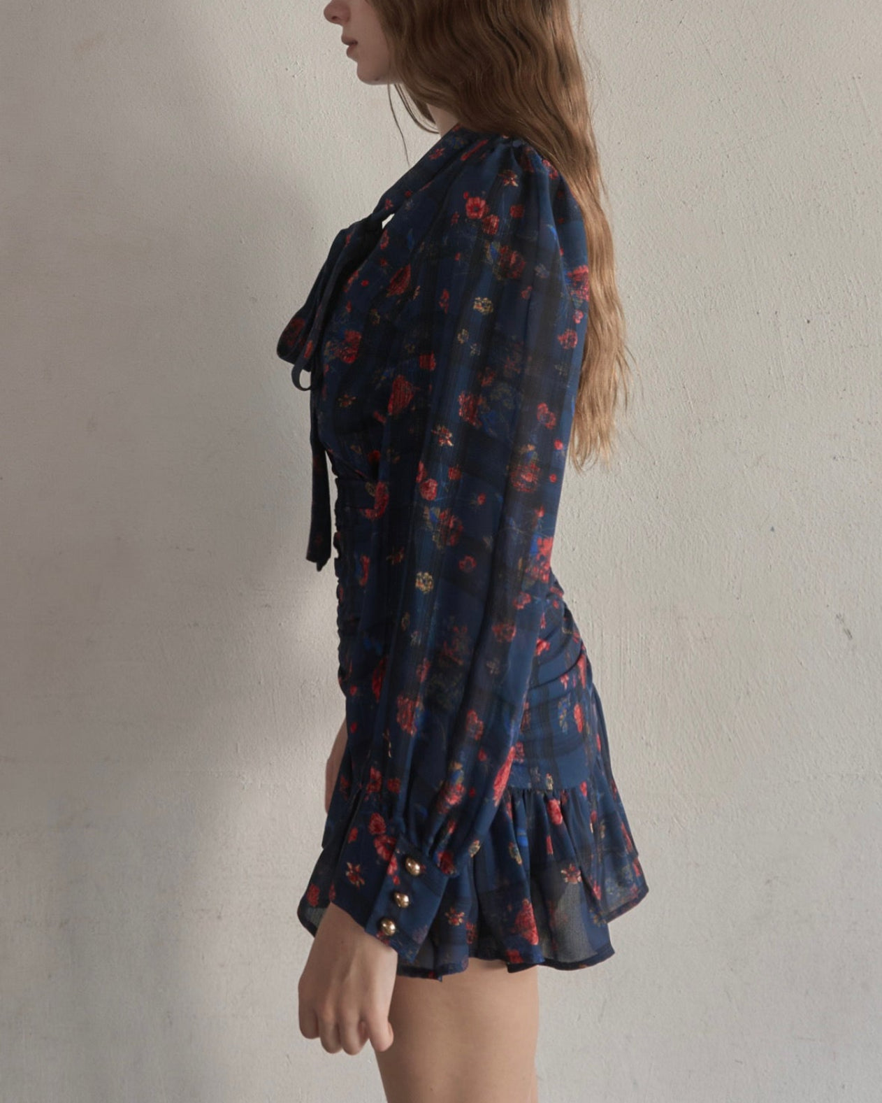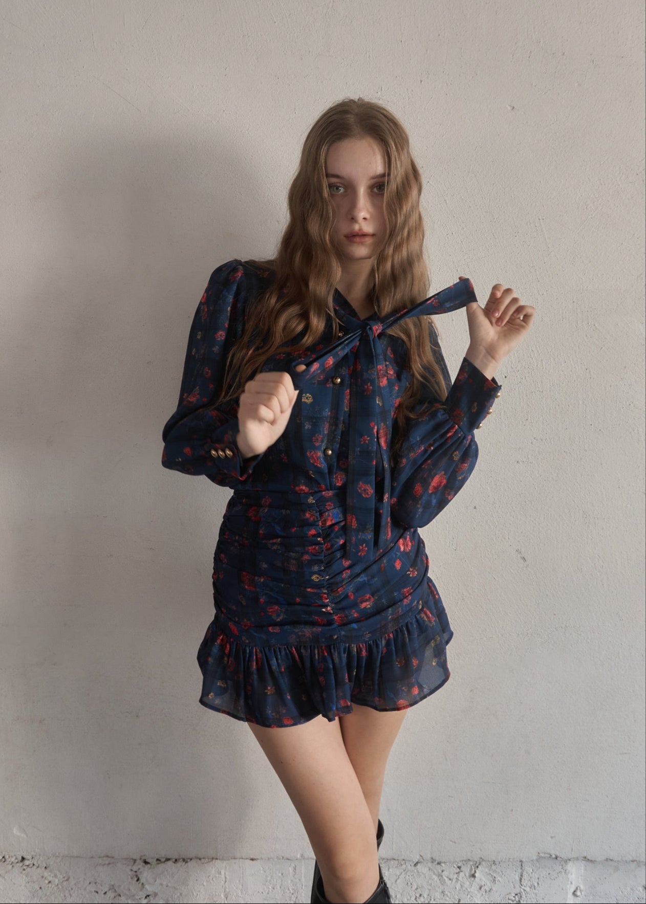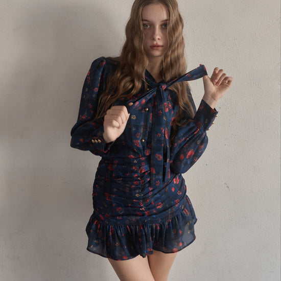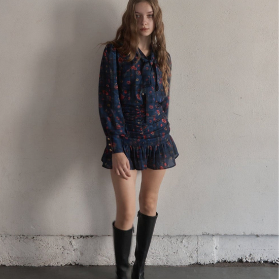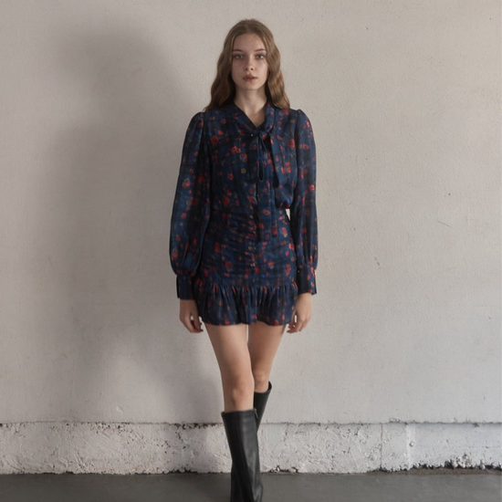 スカートはタイトで裾だけソフトに広がっており、首元のタイも細身で全体的にスッキリしたシルエットに仕上がっております。