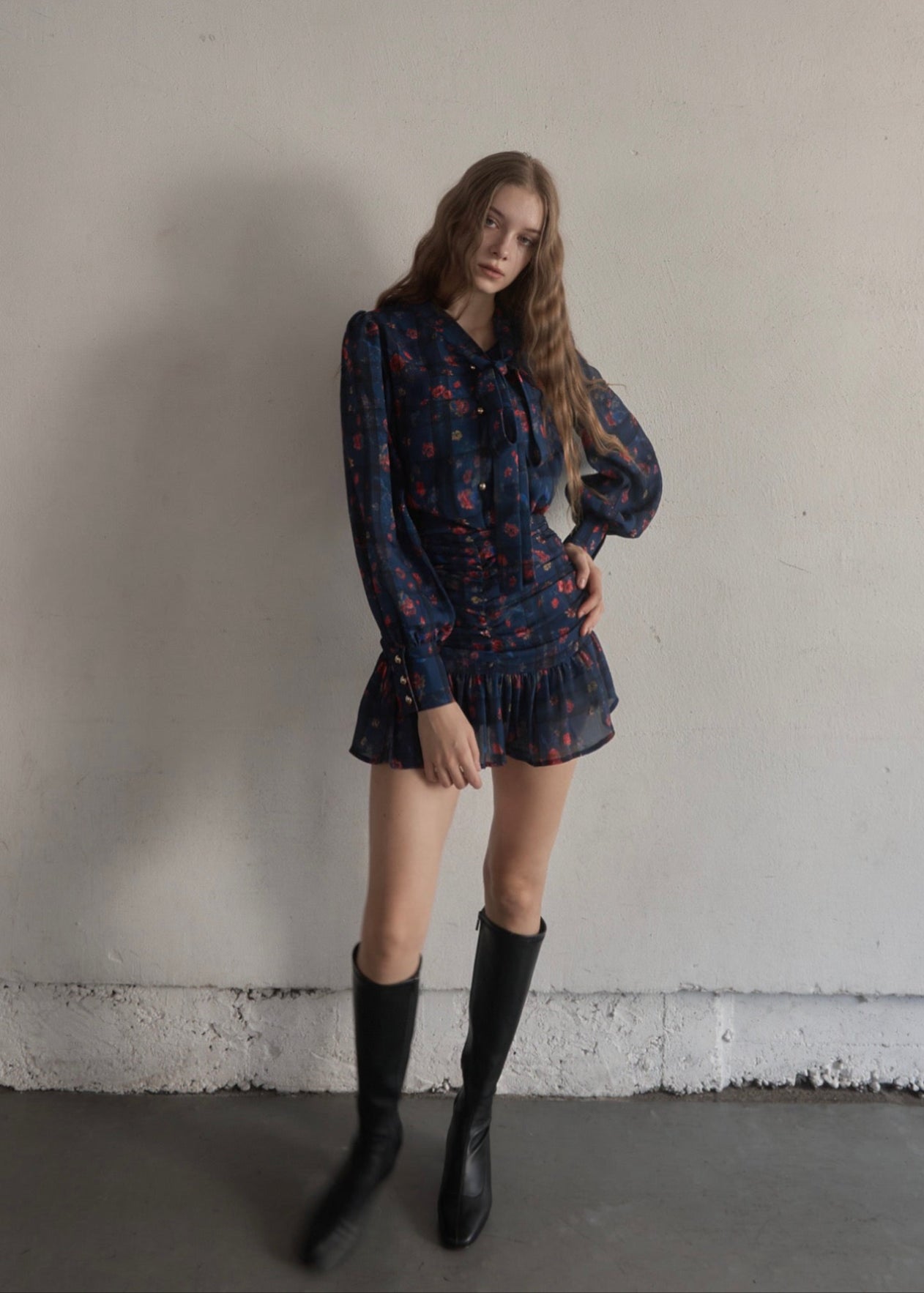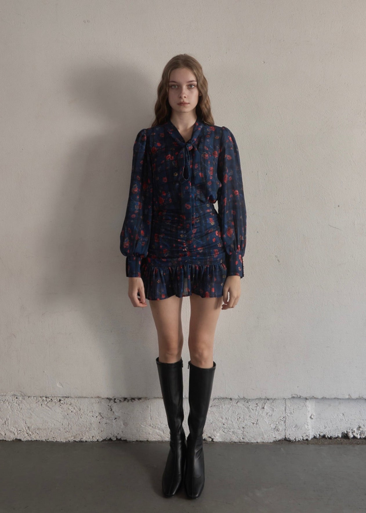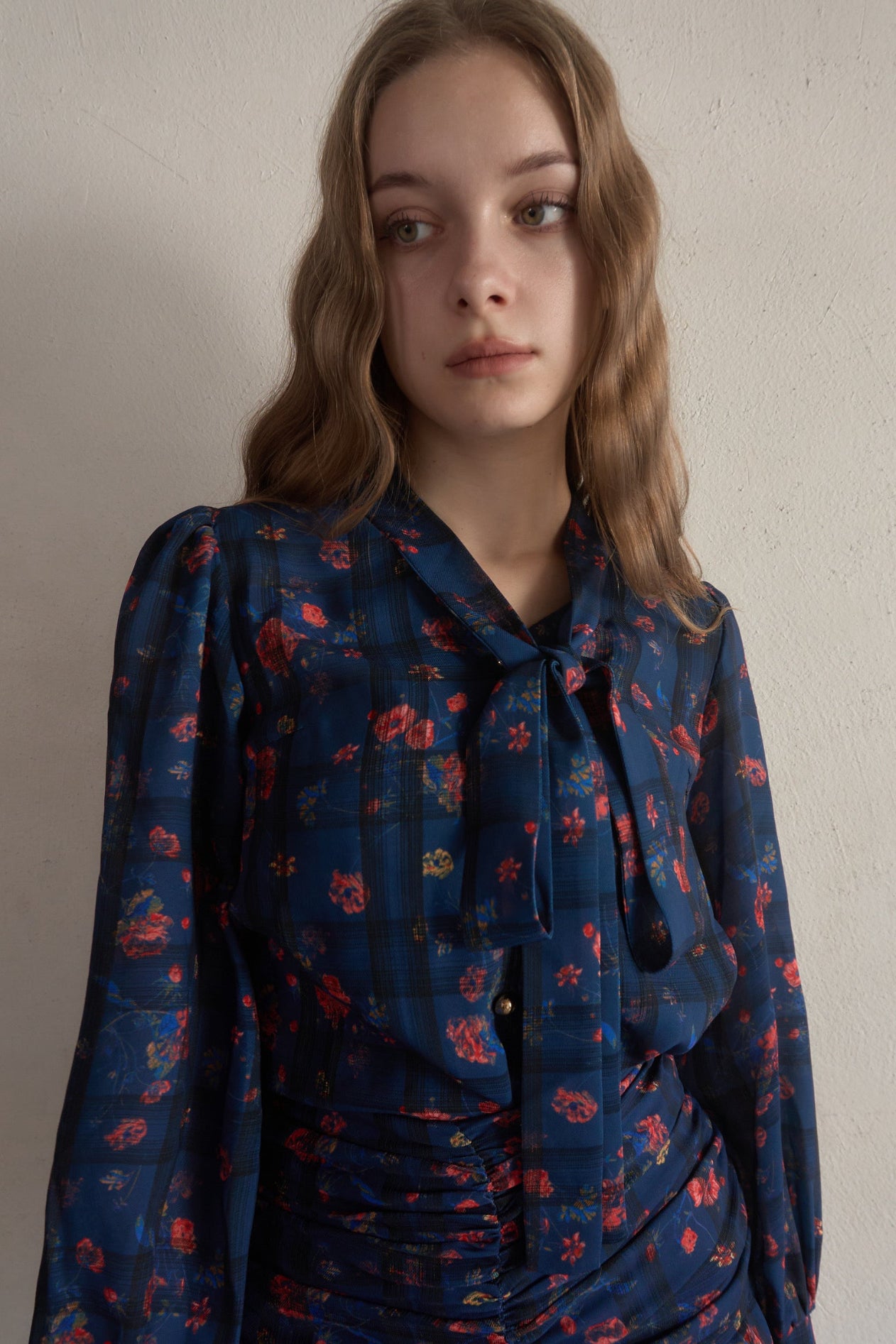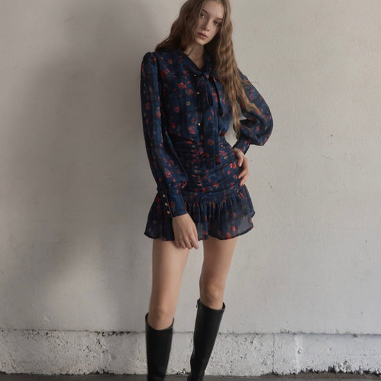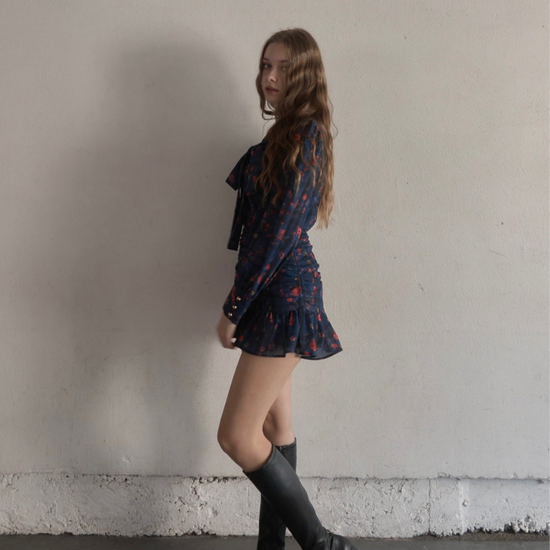 スカートはタイトで裾だけソフトに広がっており、首元のタイも細身で全体的にスッキリしたシルエットに仕上がっております。