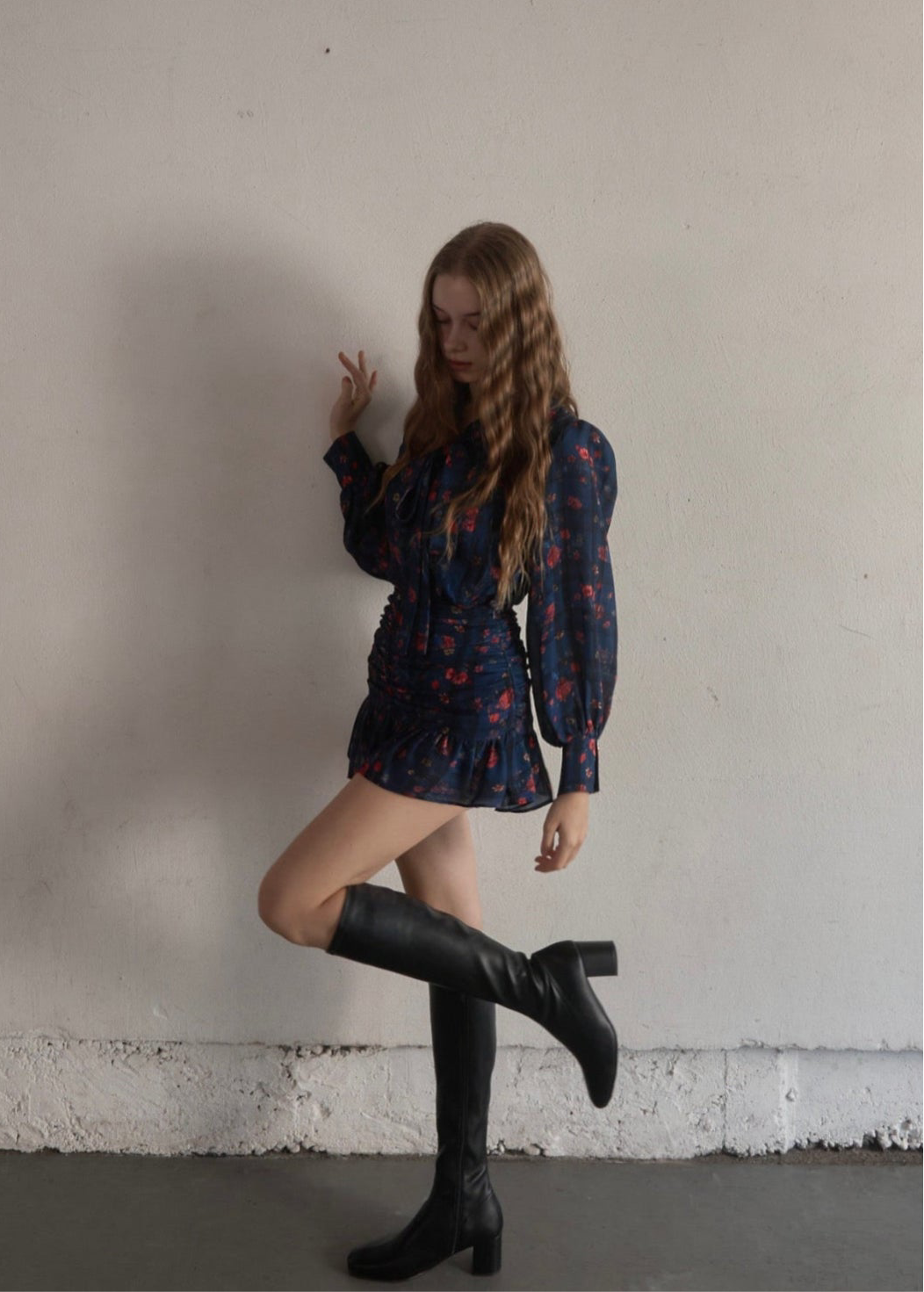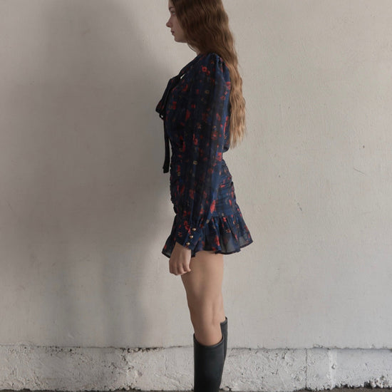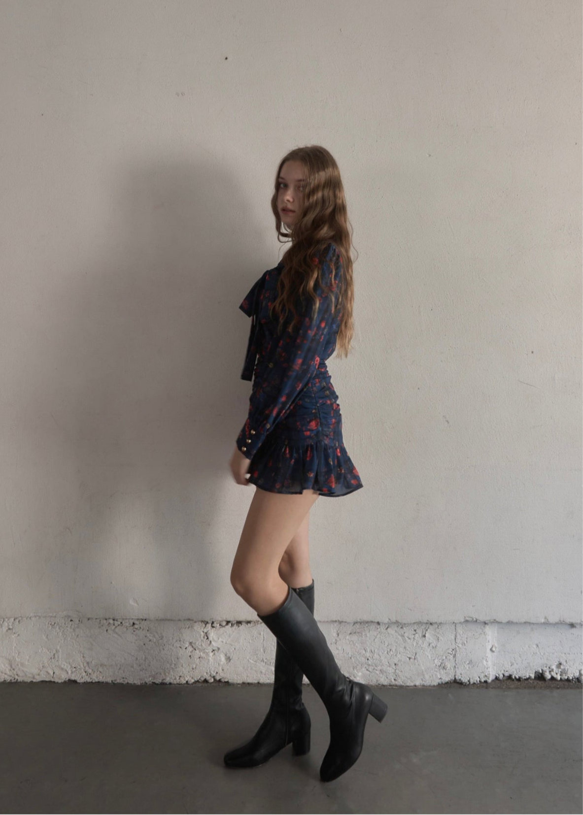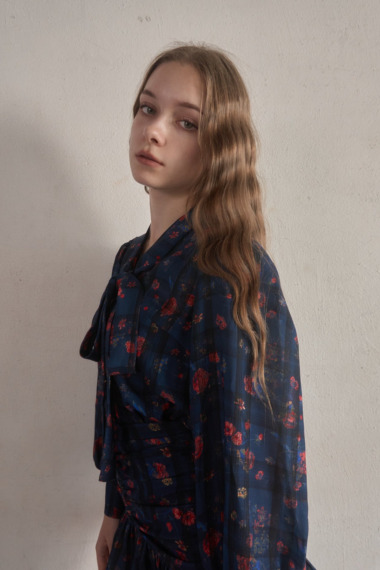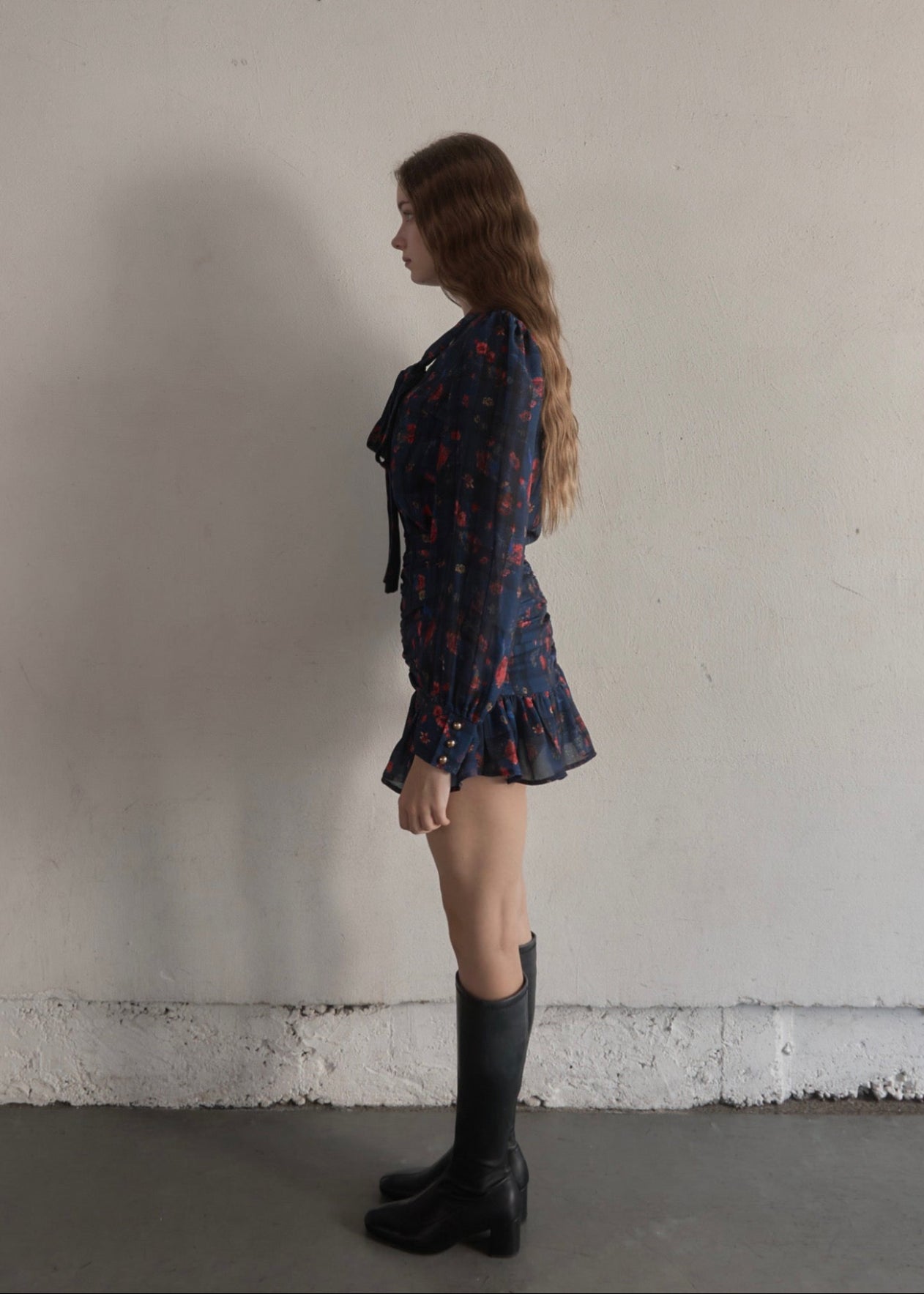 スカートはタイトで裾だけソフトに広がっており、首元のタイも細身で全体的にスッキリしたシルエットに仕上がっております。