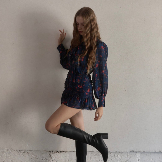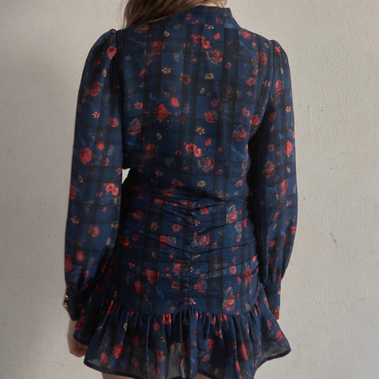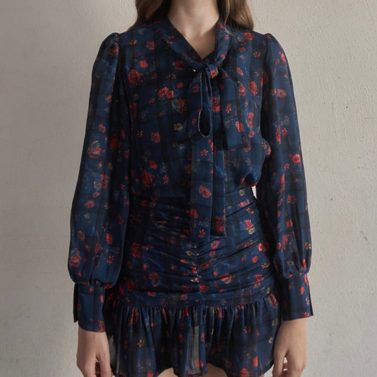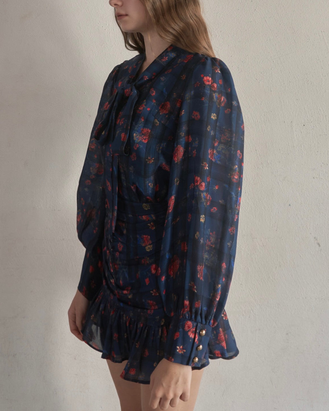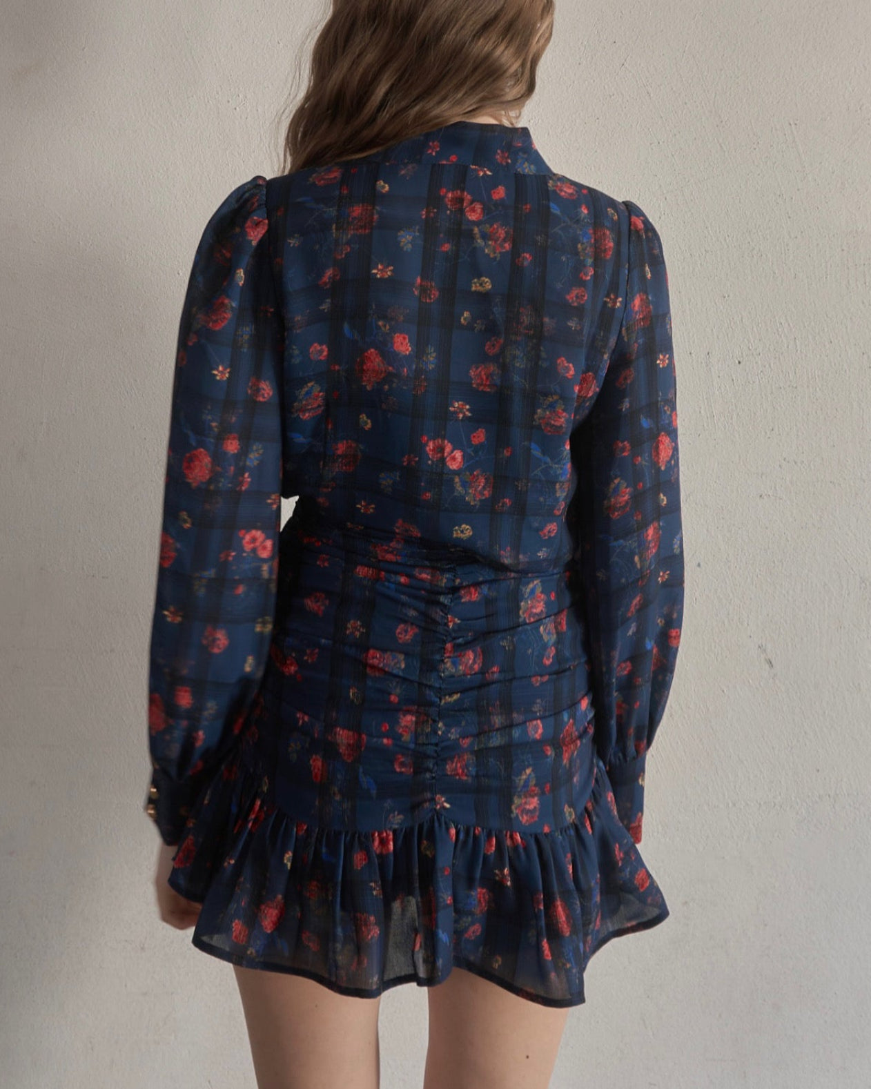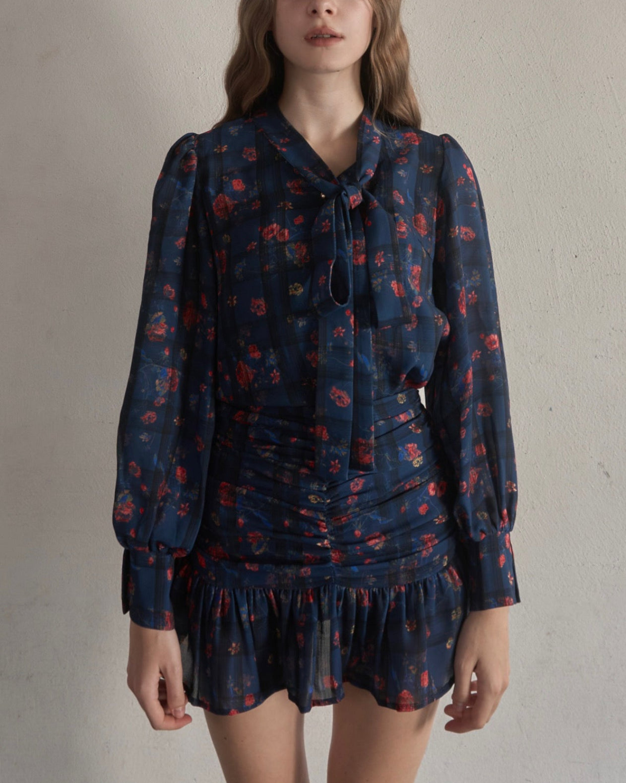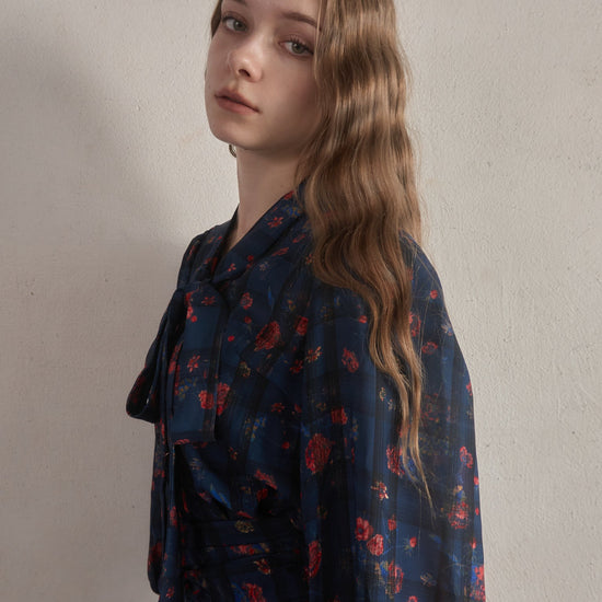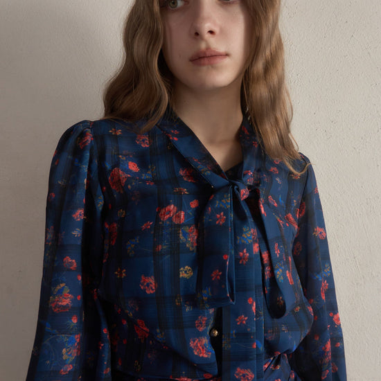 お花とチェックの柄が組み合わされた華やかで目を惹くセットアップ。