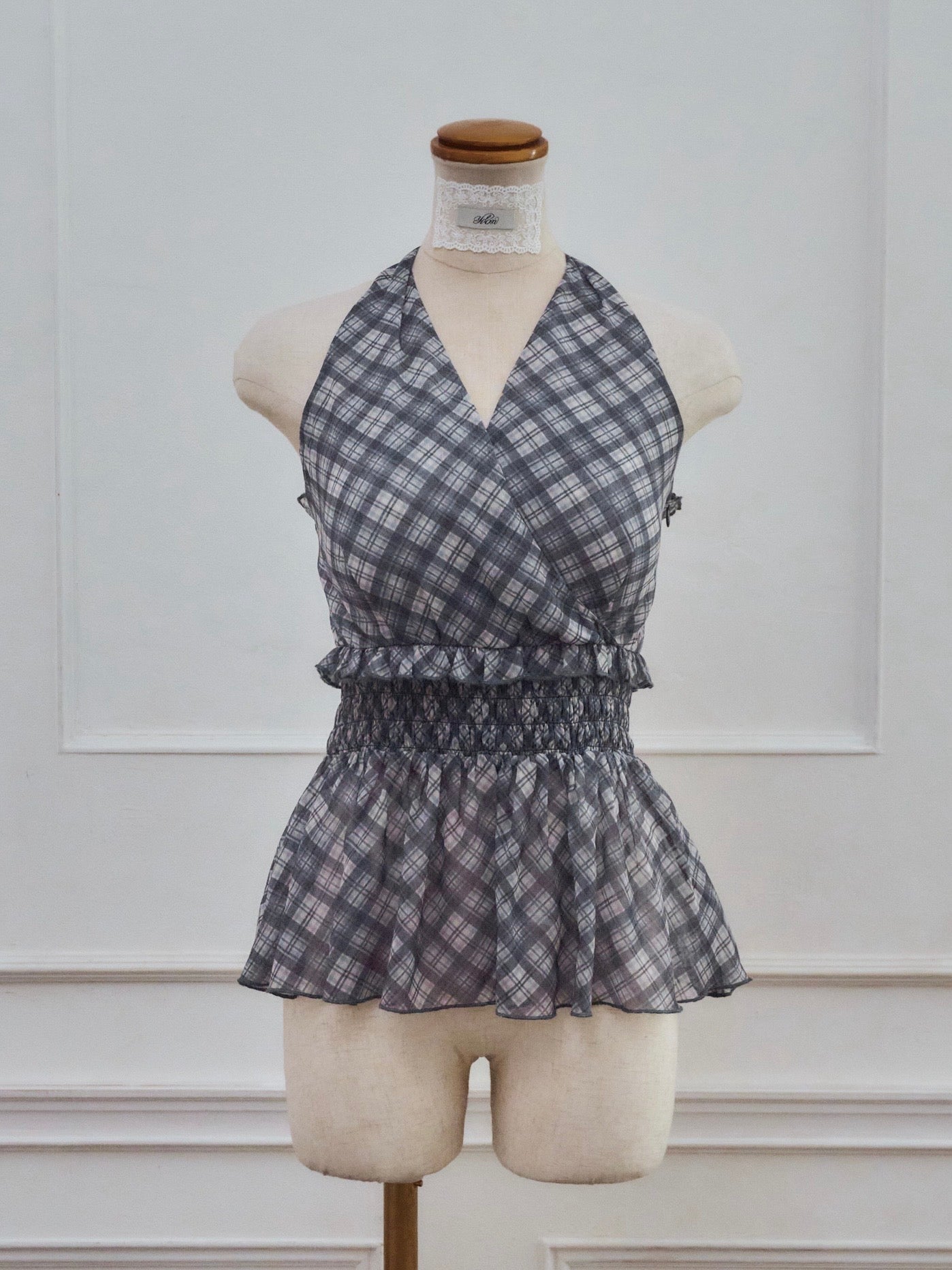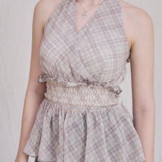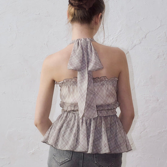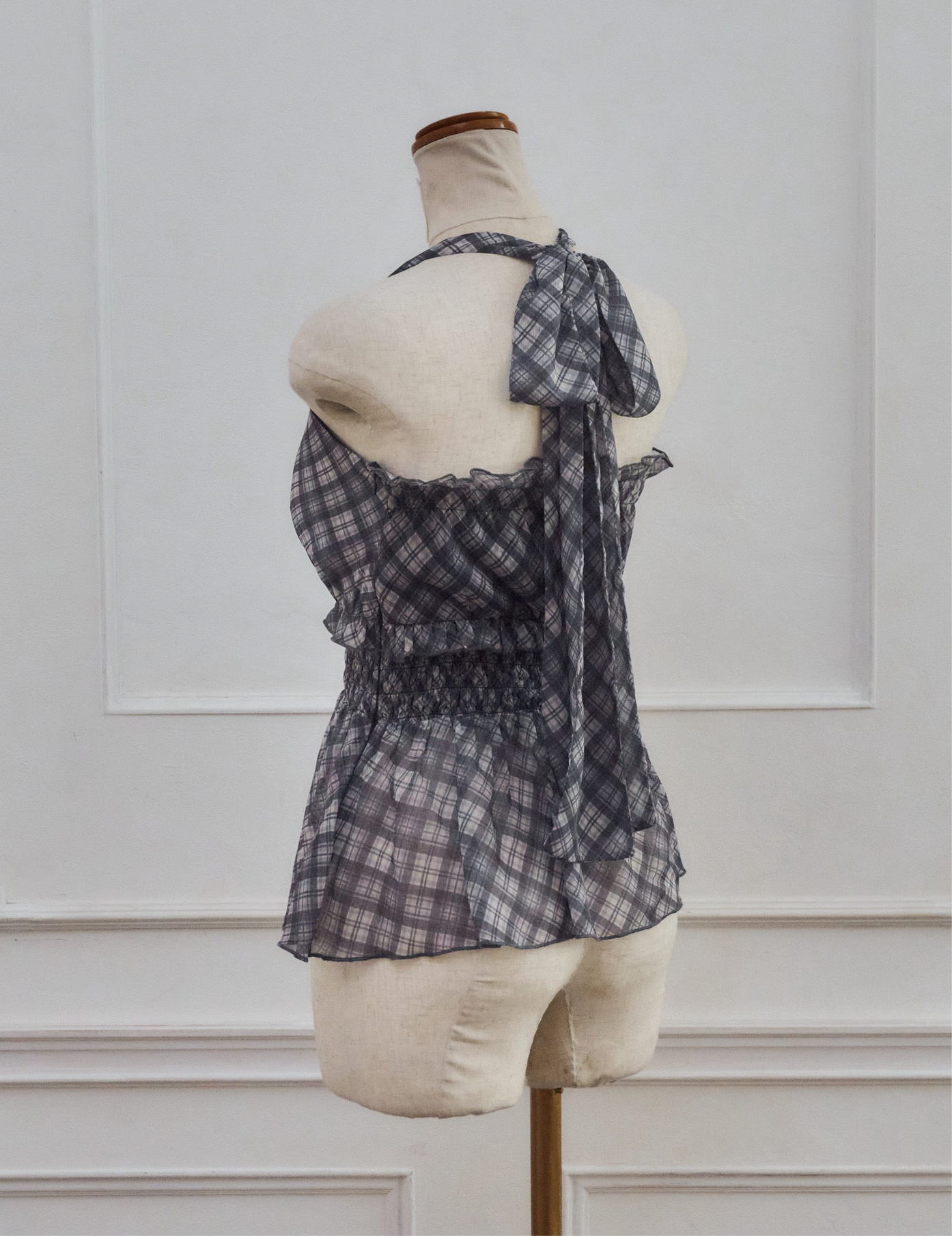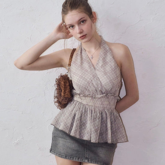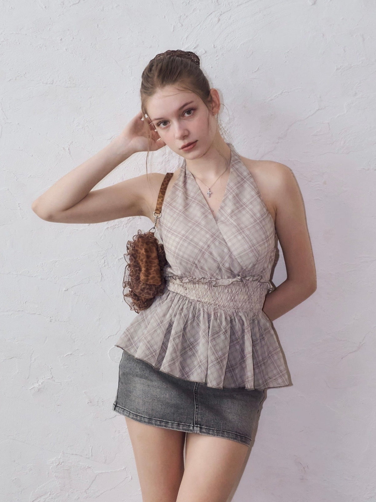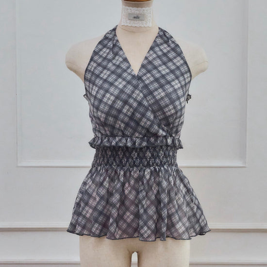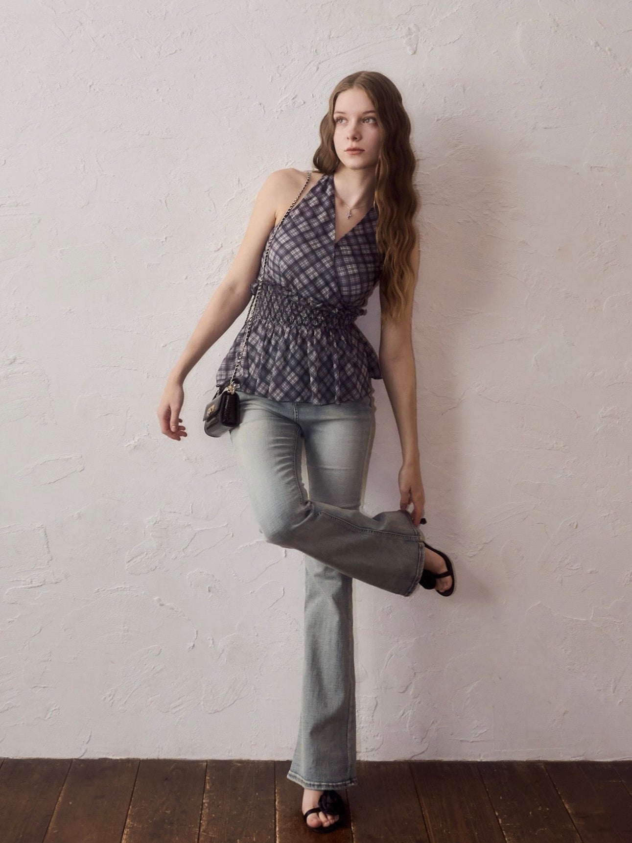 深めのVネックが印象的で、アンニュイな色気と少女感のあるチェック柄が混じり合った綺麗目なブラウス。
