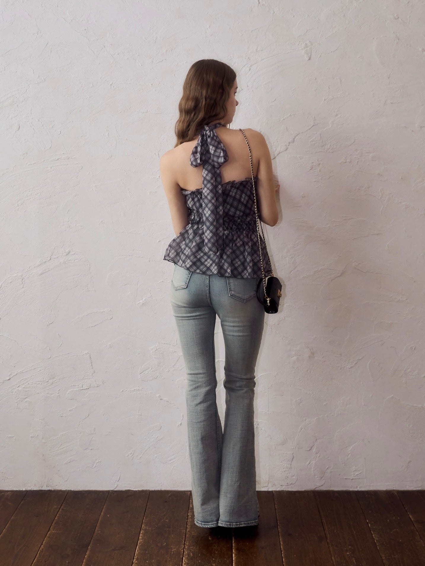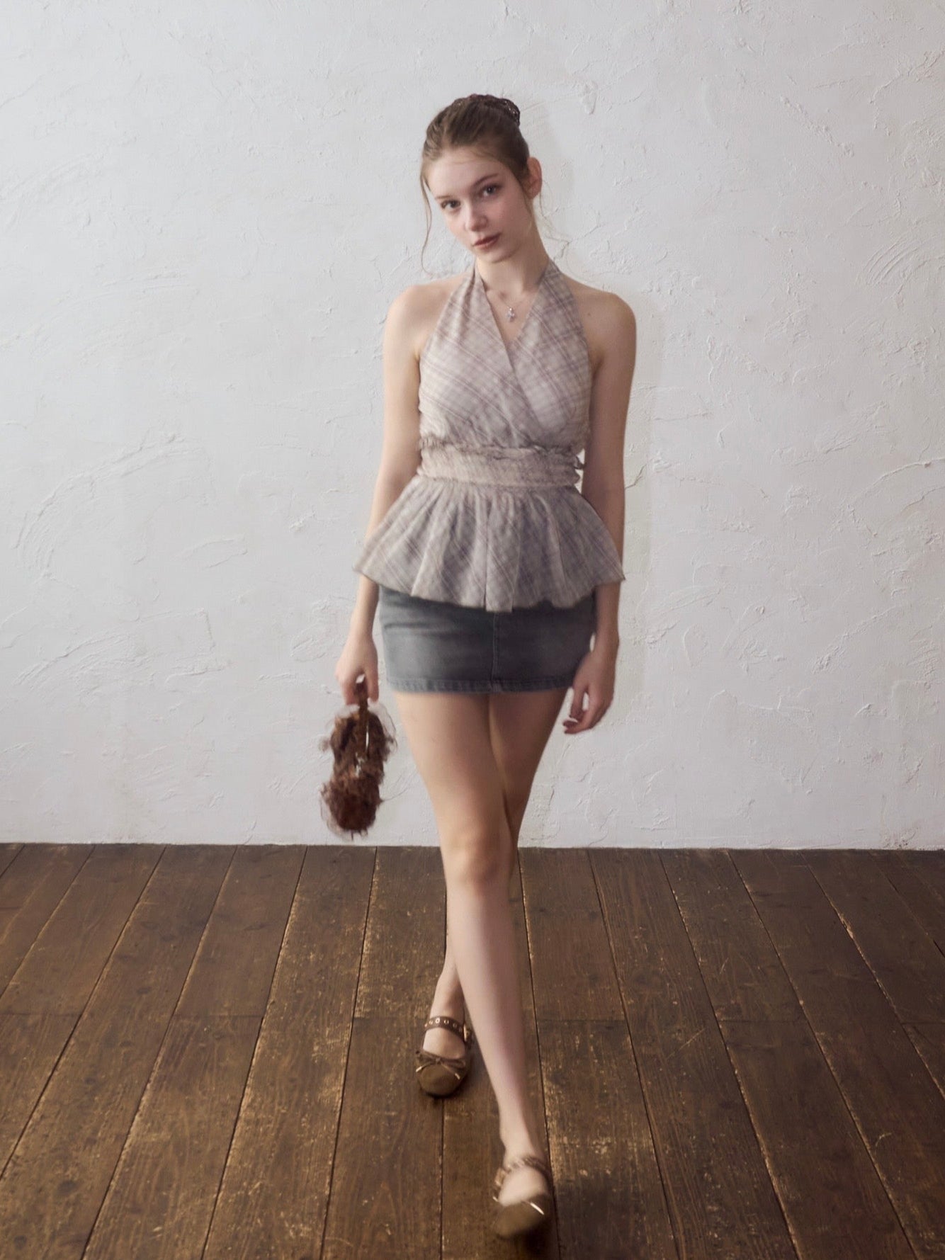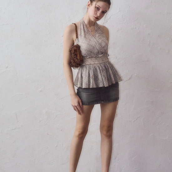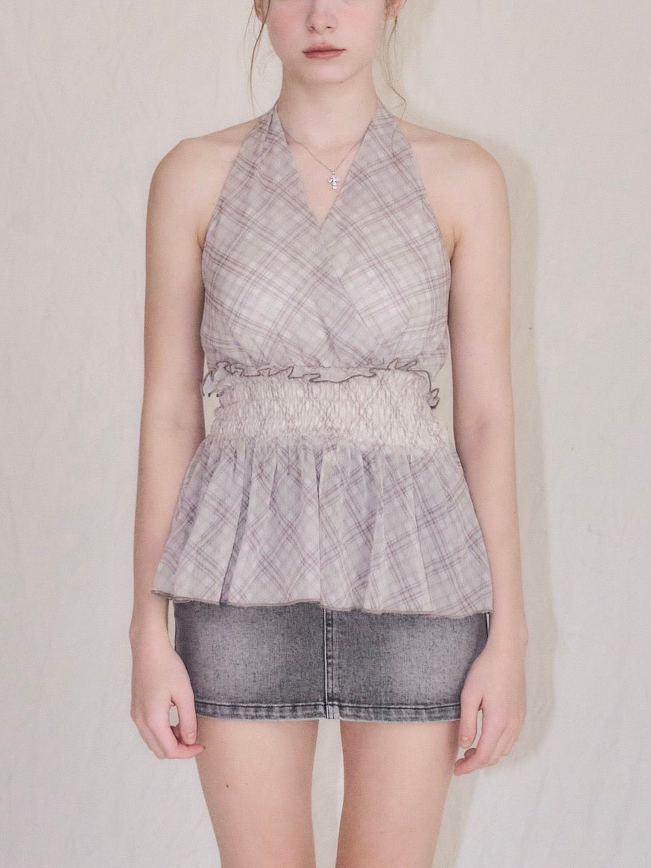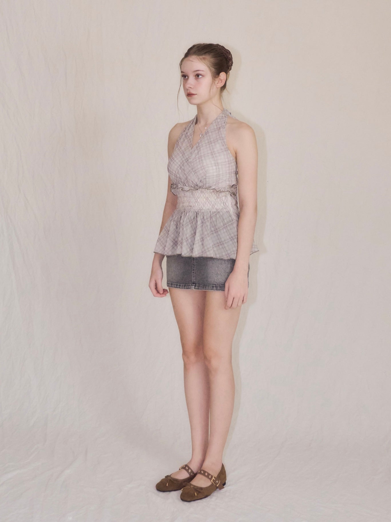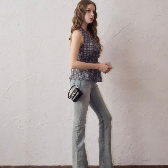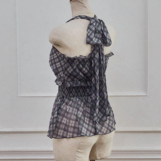 深めのVネックが印象的で、アンニュイな色気と少女感のあるチェック柄が混じり合った綺麗目なブラウス。