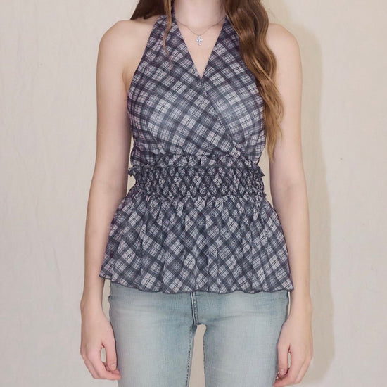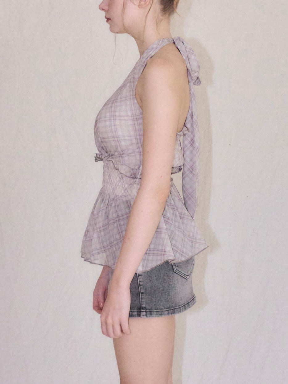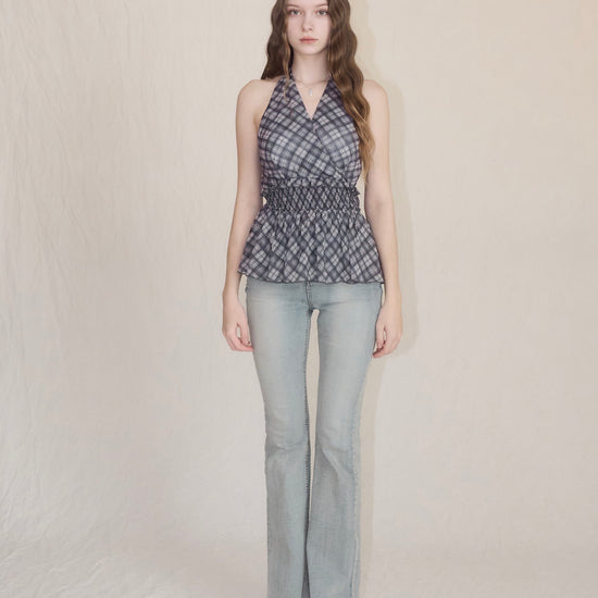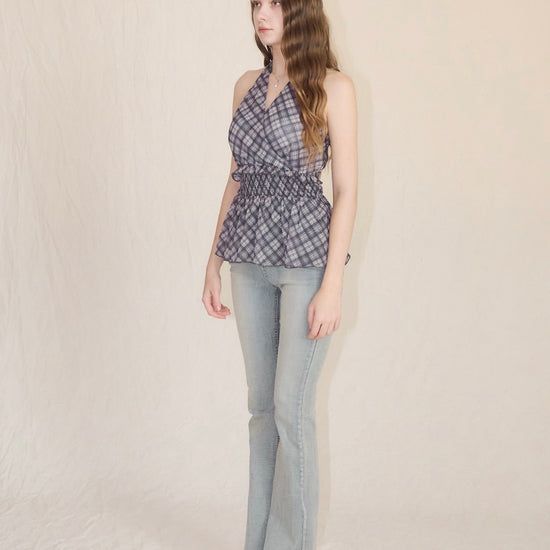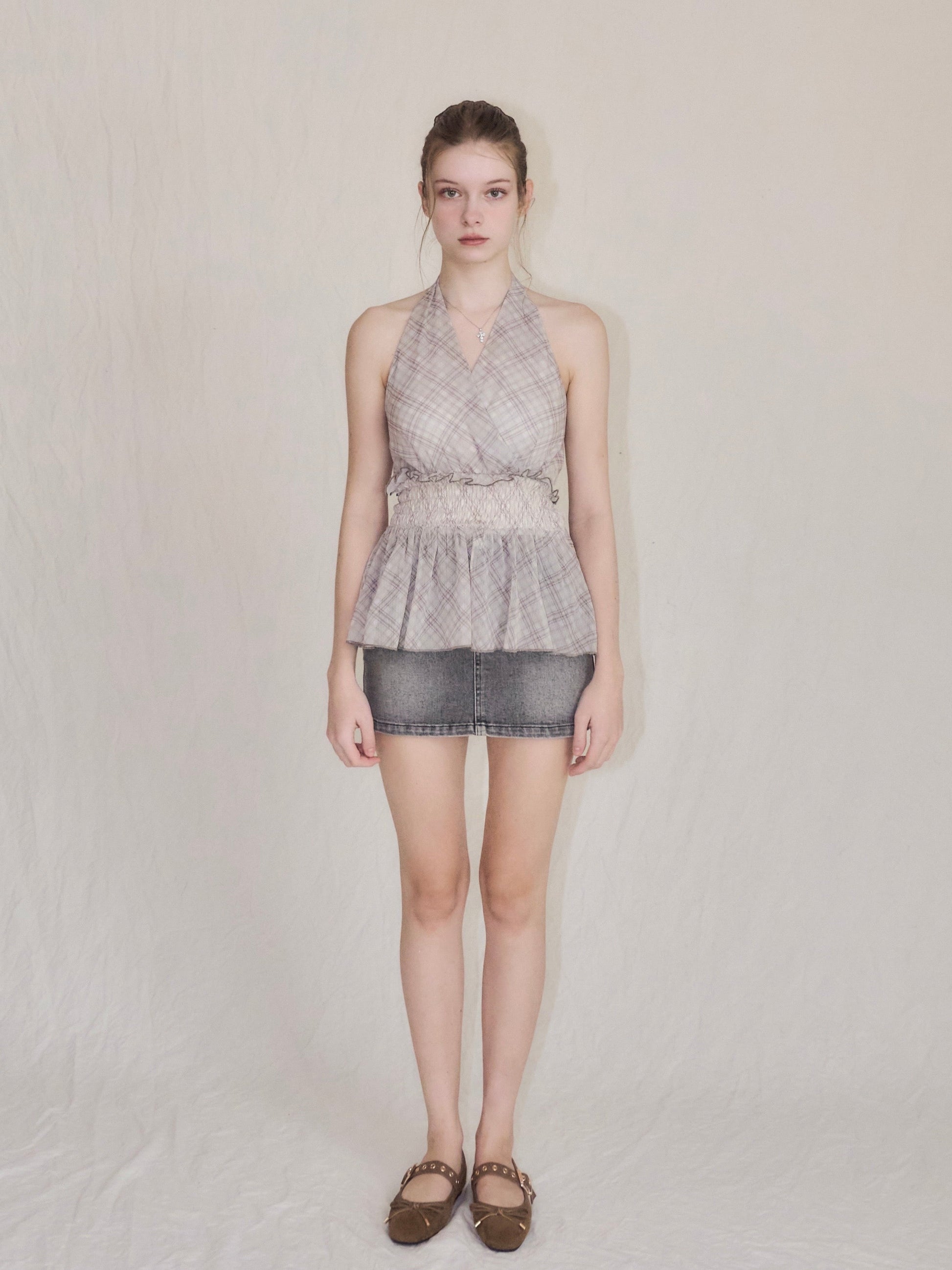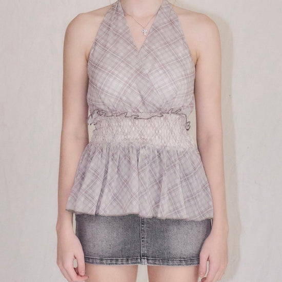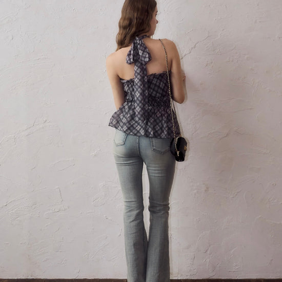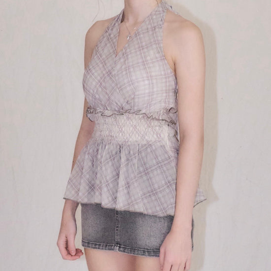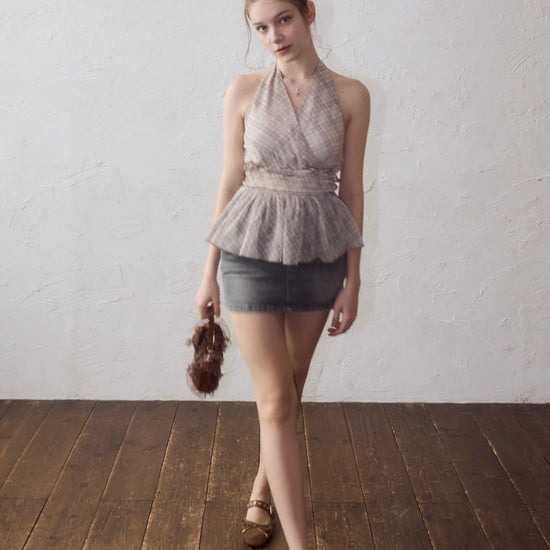 深めのVネックが印象的で、アンニュイな色気と少女感のあるチェック柄が混じり合った綺麗目なブラウス。