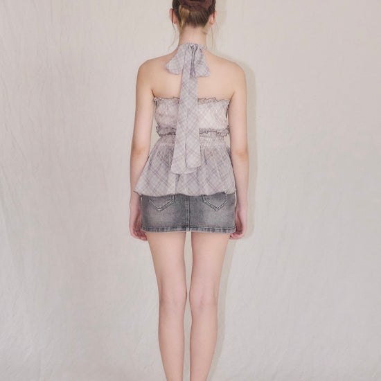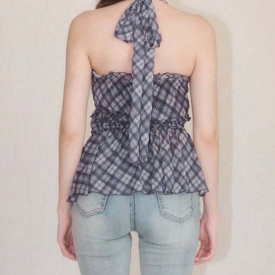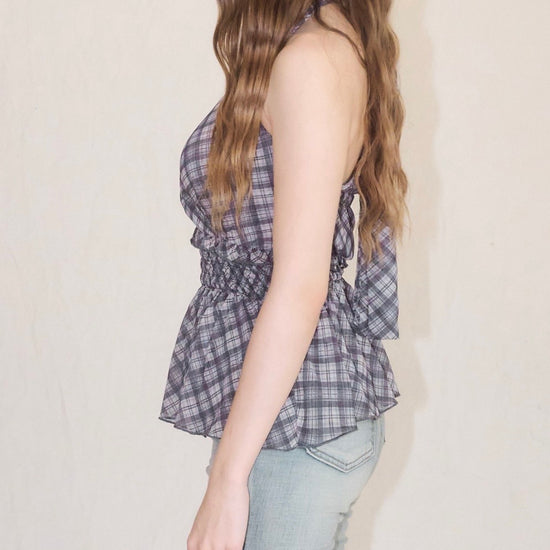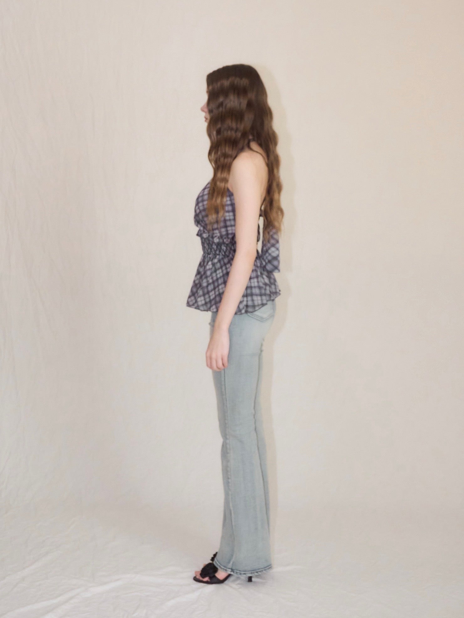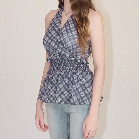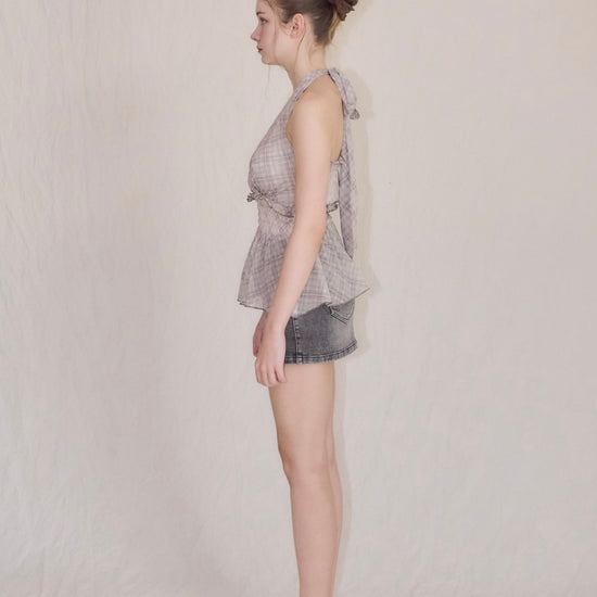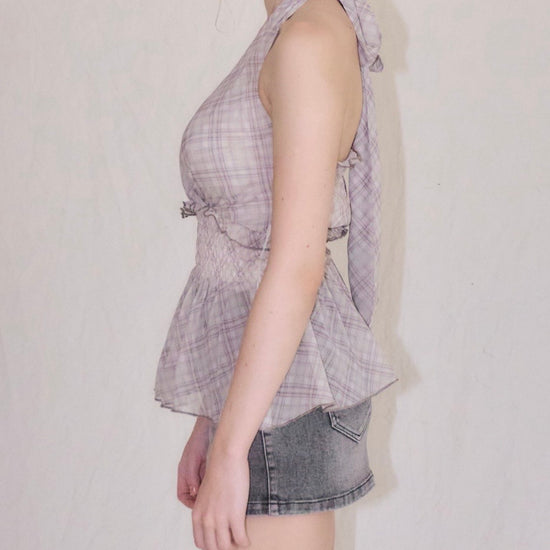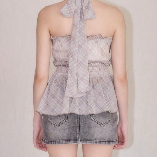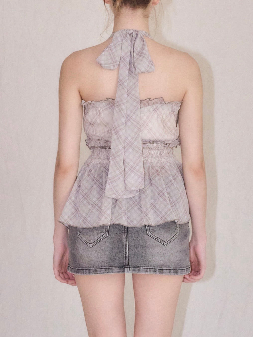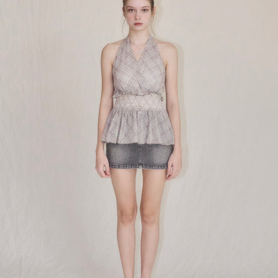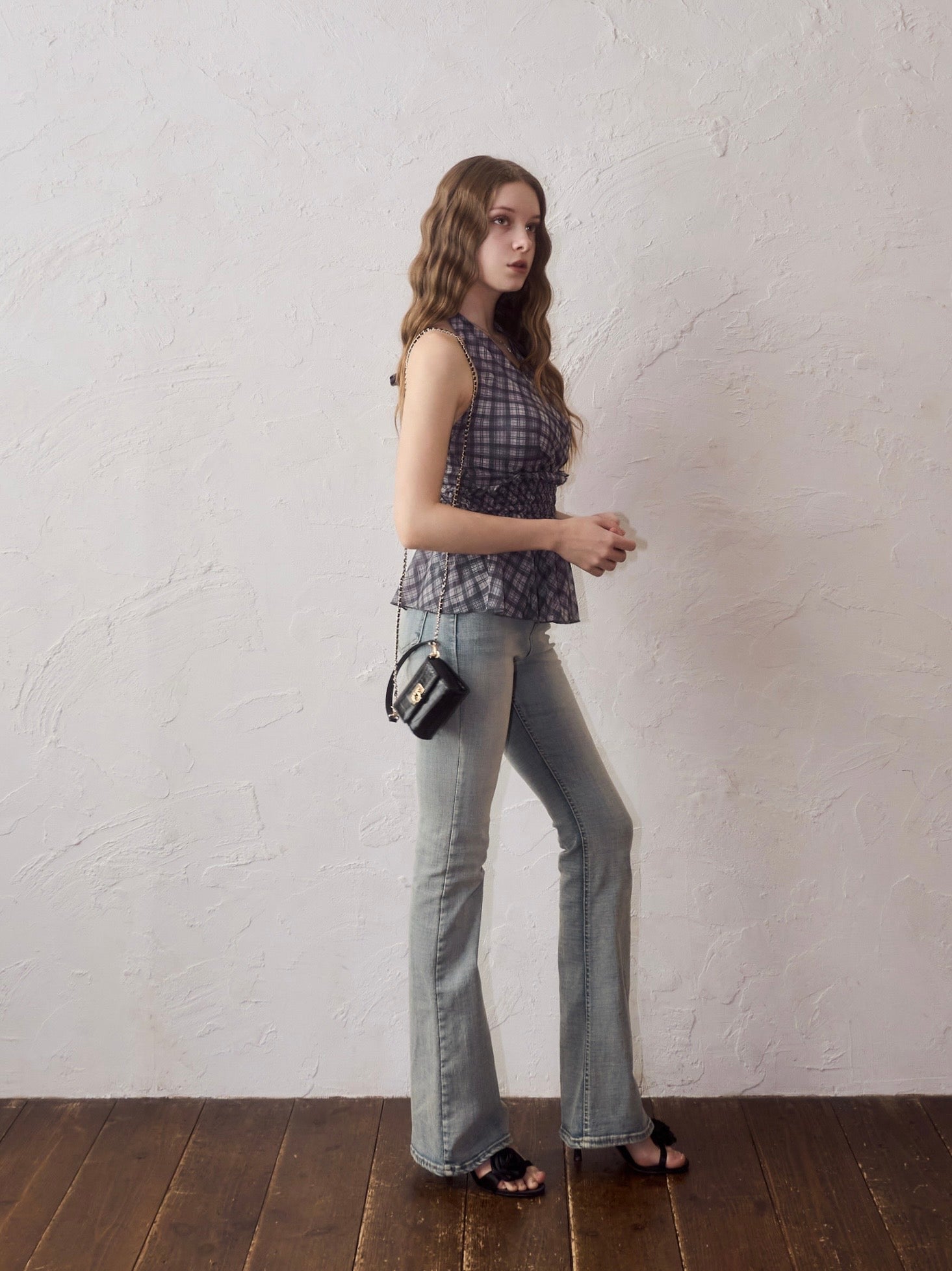 深めのVネックが印象的で、アンニュイな色気と少女感のあるチェック柄が混じり合った綺麗目なブラウス。