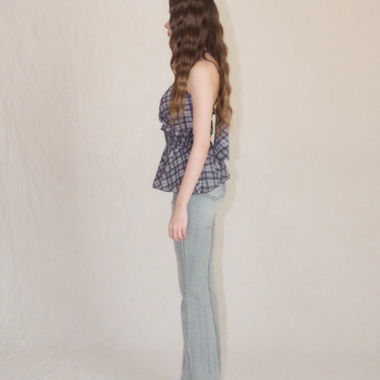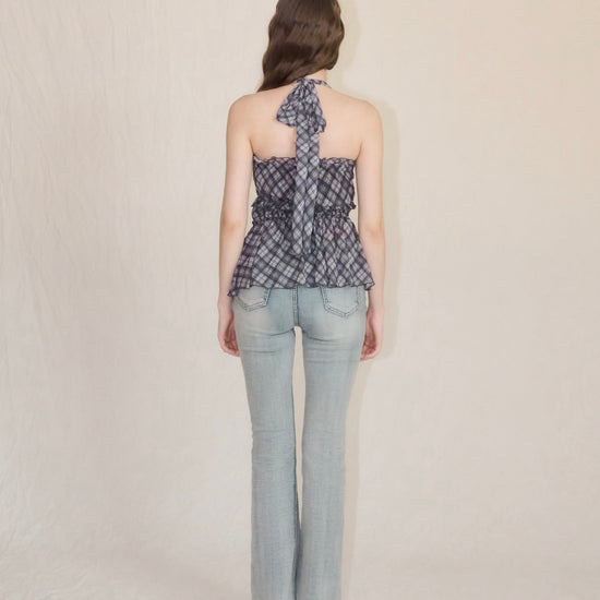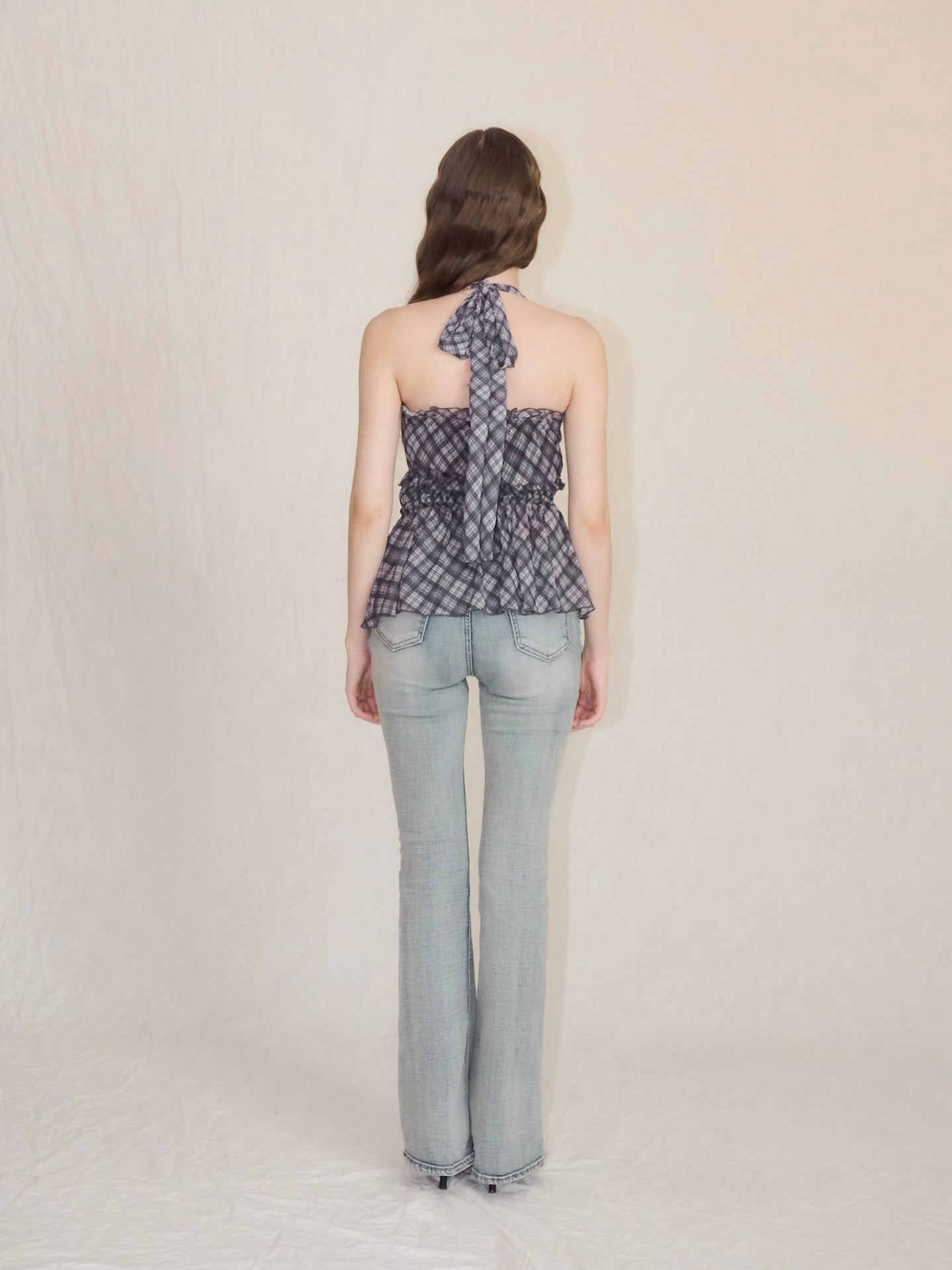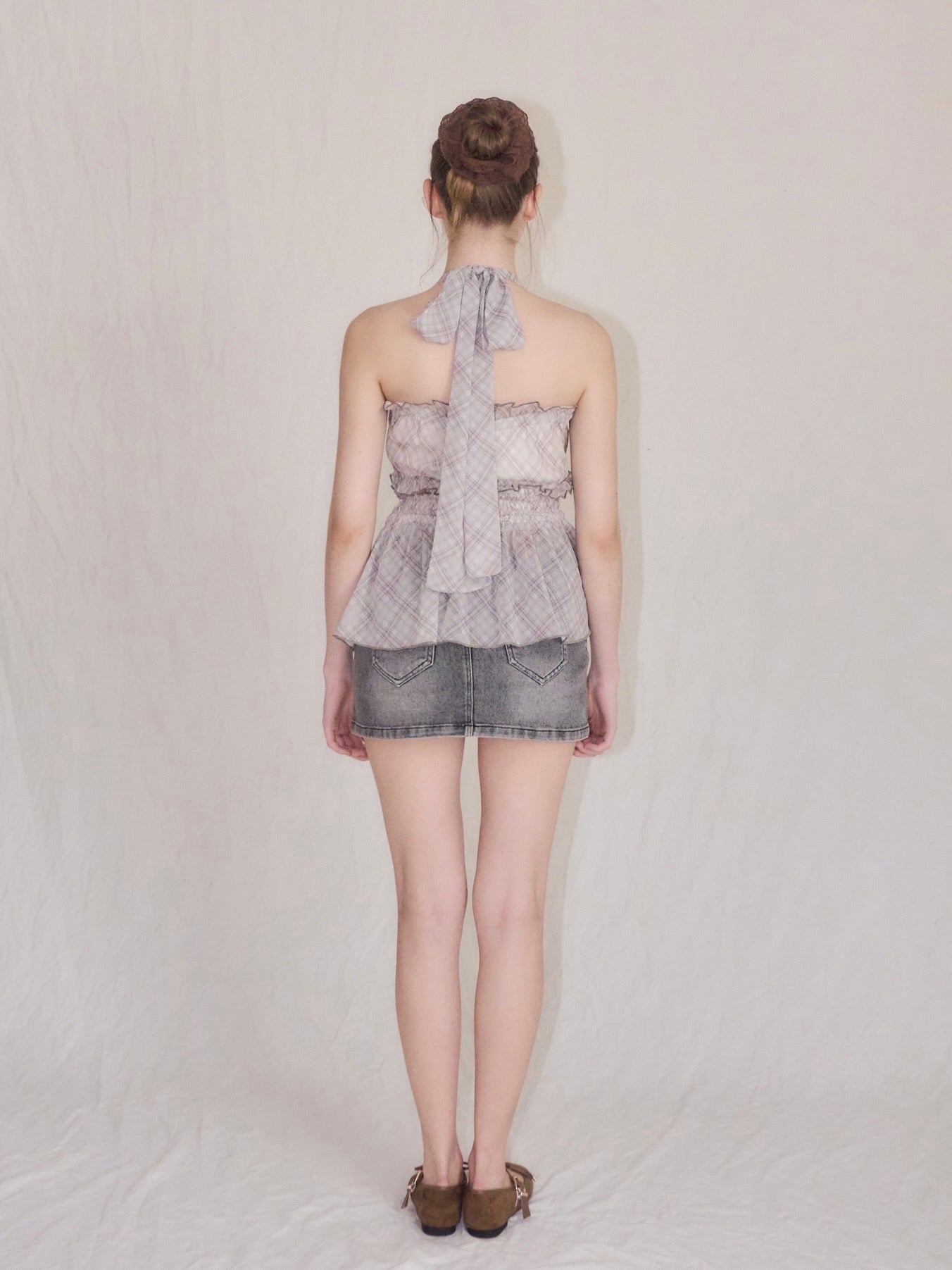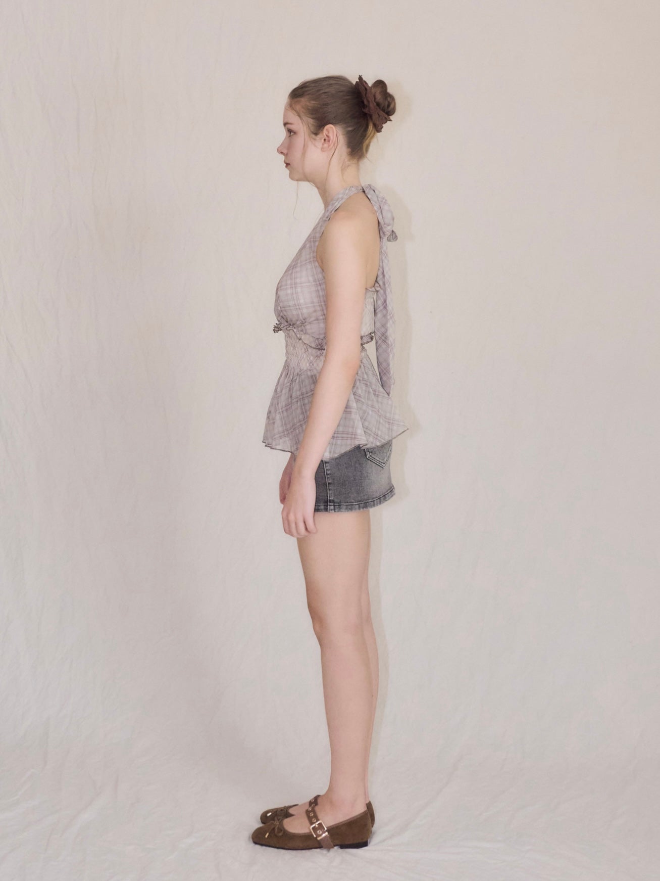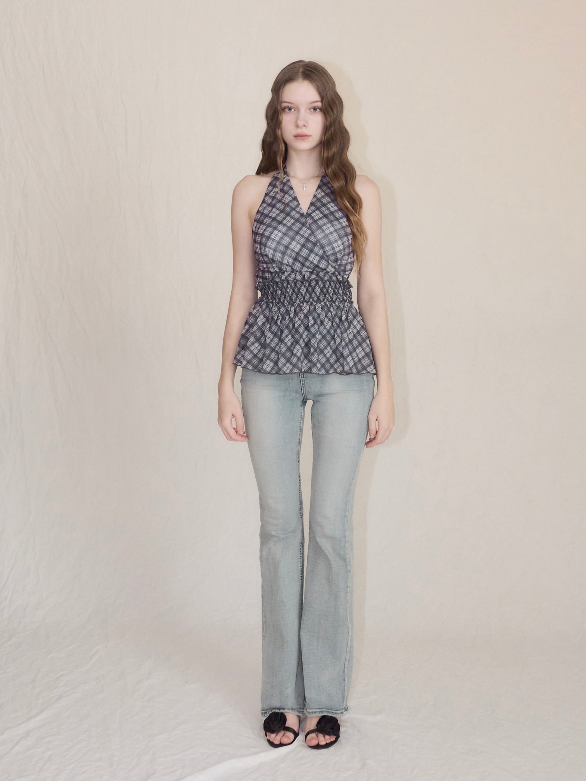 深めのVネックが印象的で、アンニュイな色気と少女感のあるチェック柄が混じり合った綺麗目なブラウス。