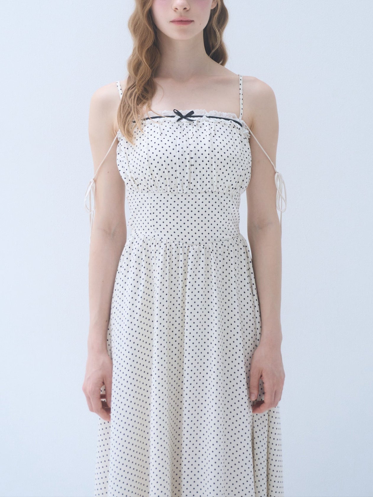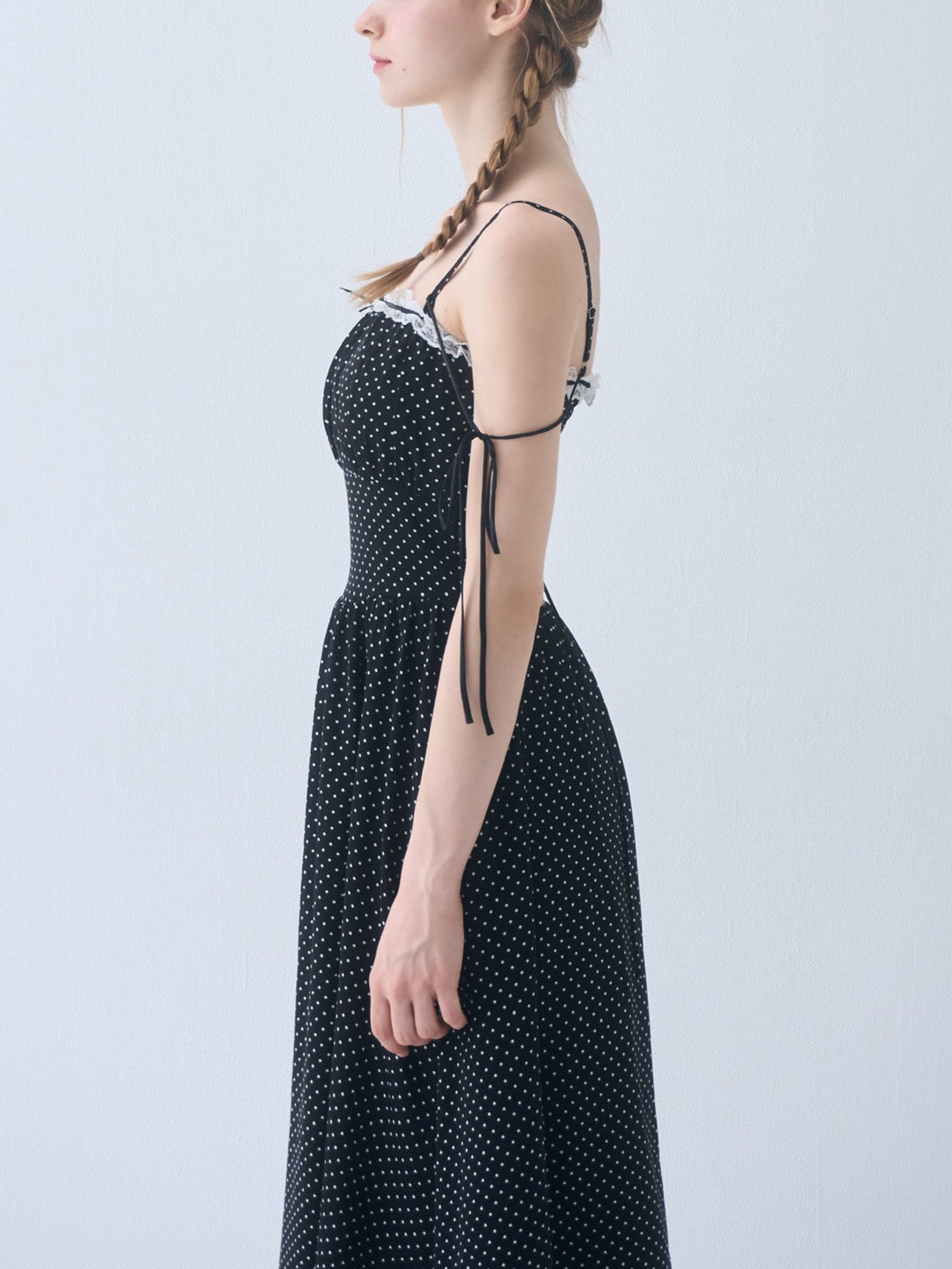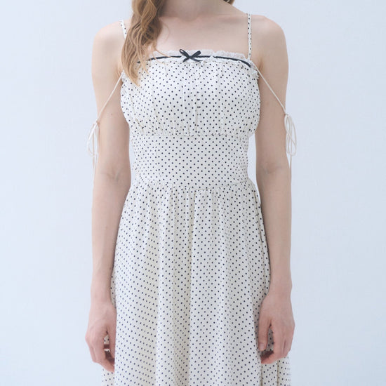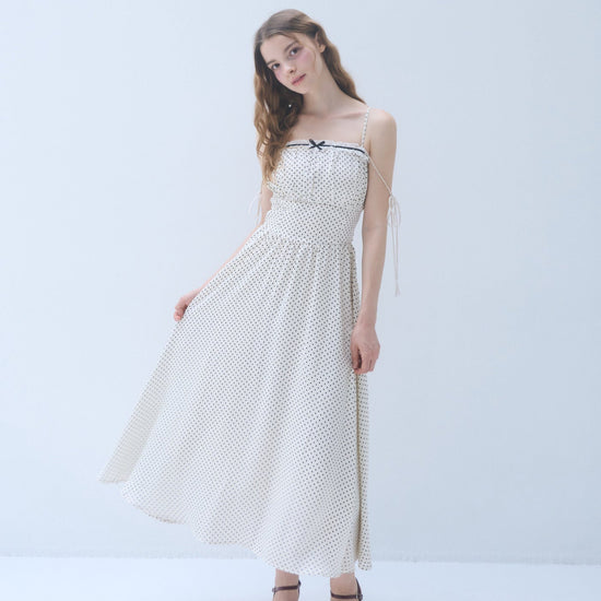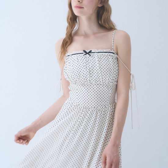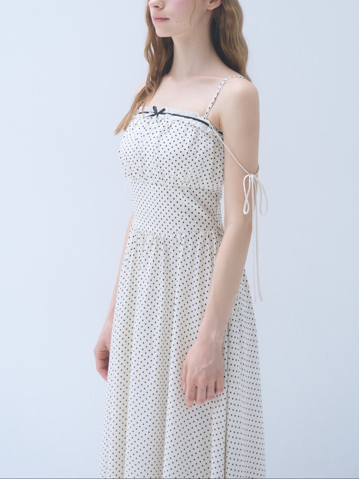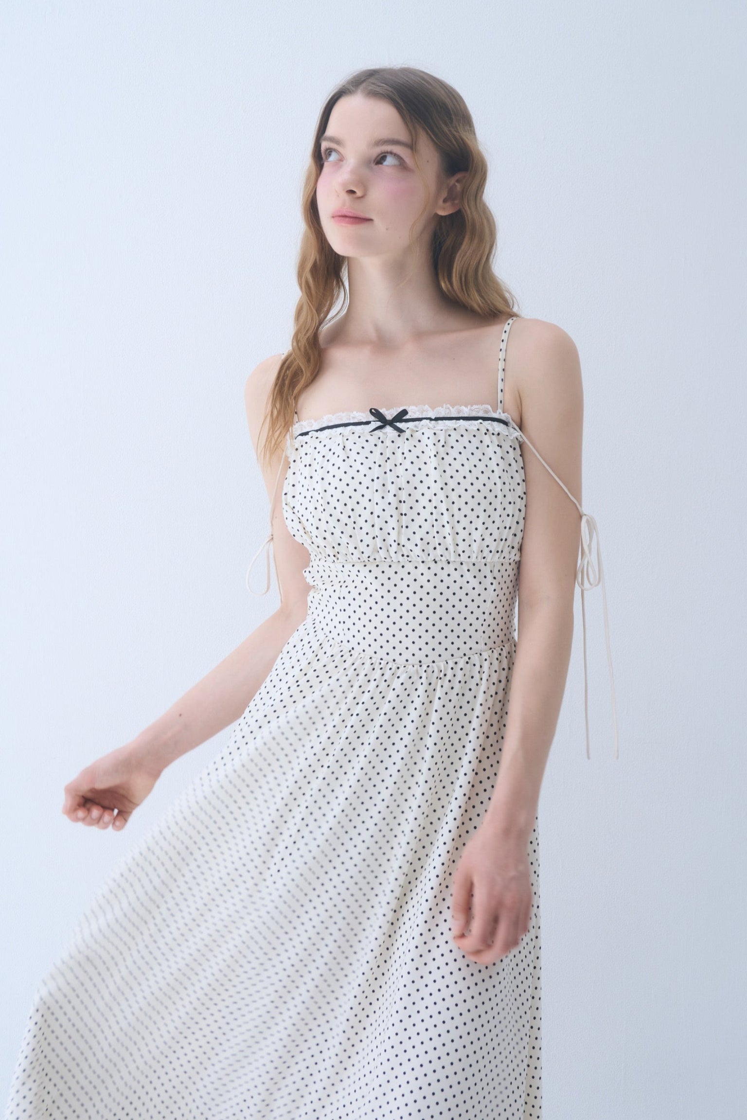 ドットの総柄と胸元のリボンが目を引く大人フレンチガーリーな印象のワンピース。