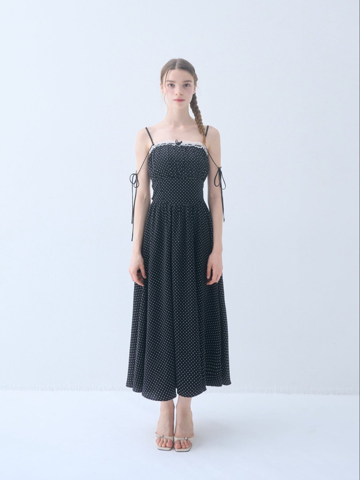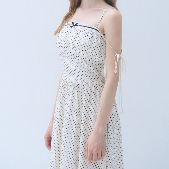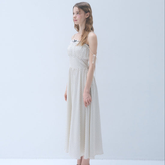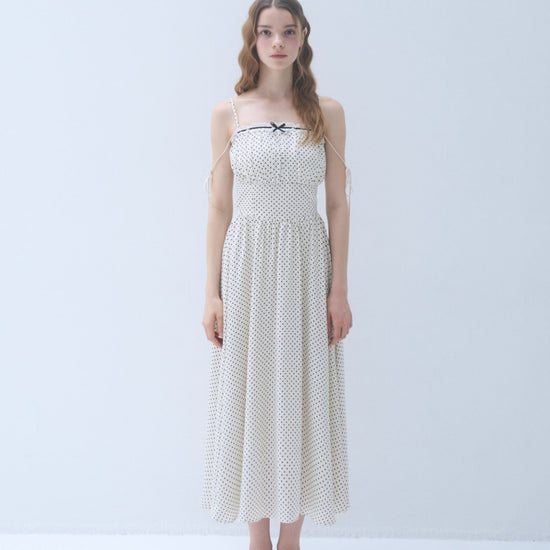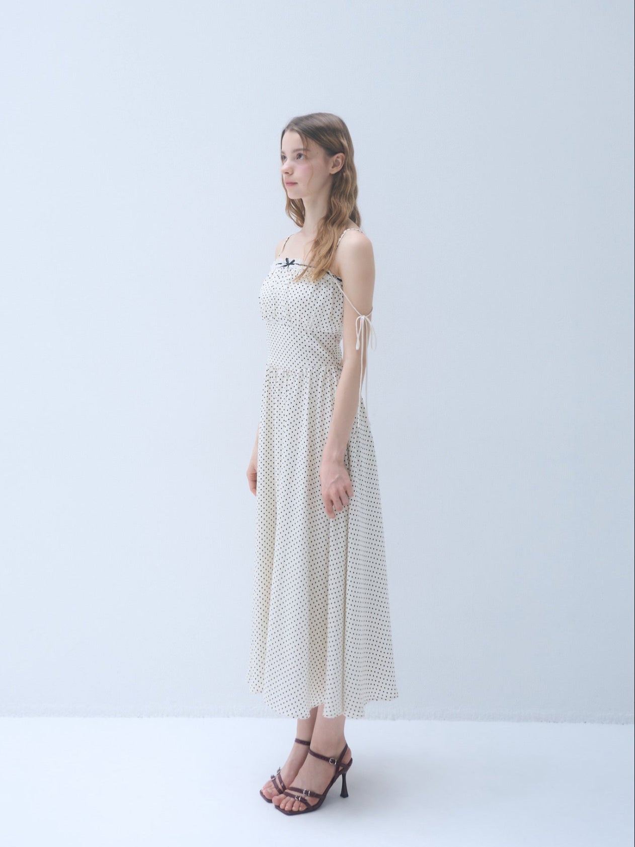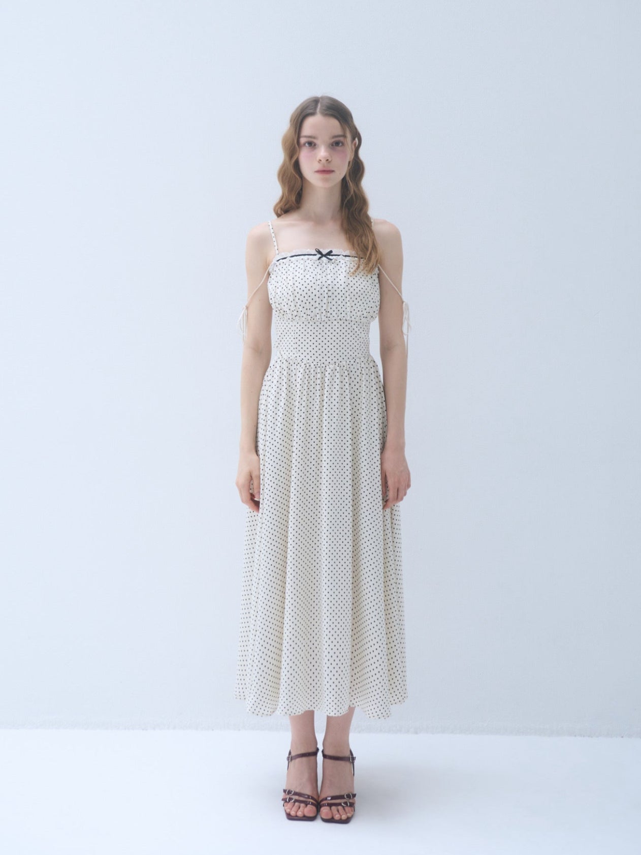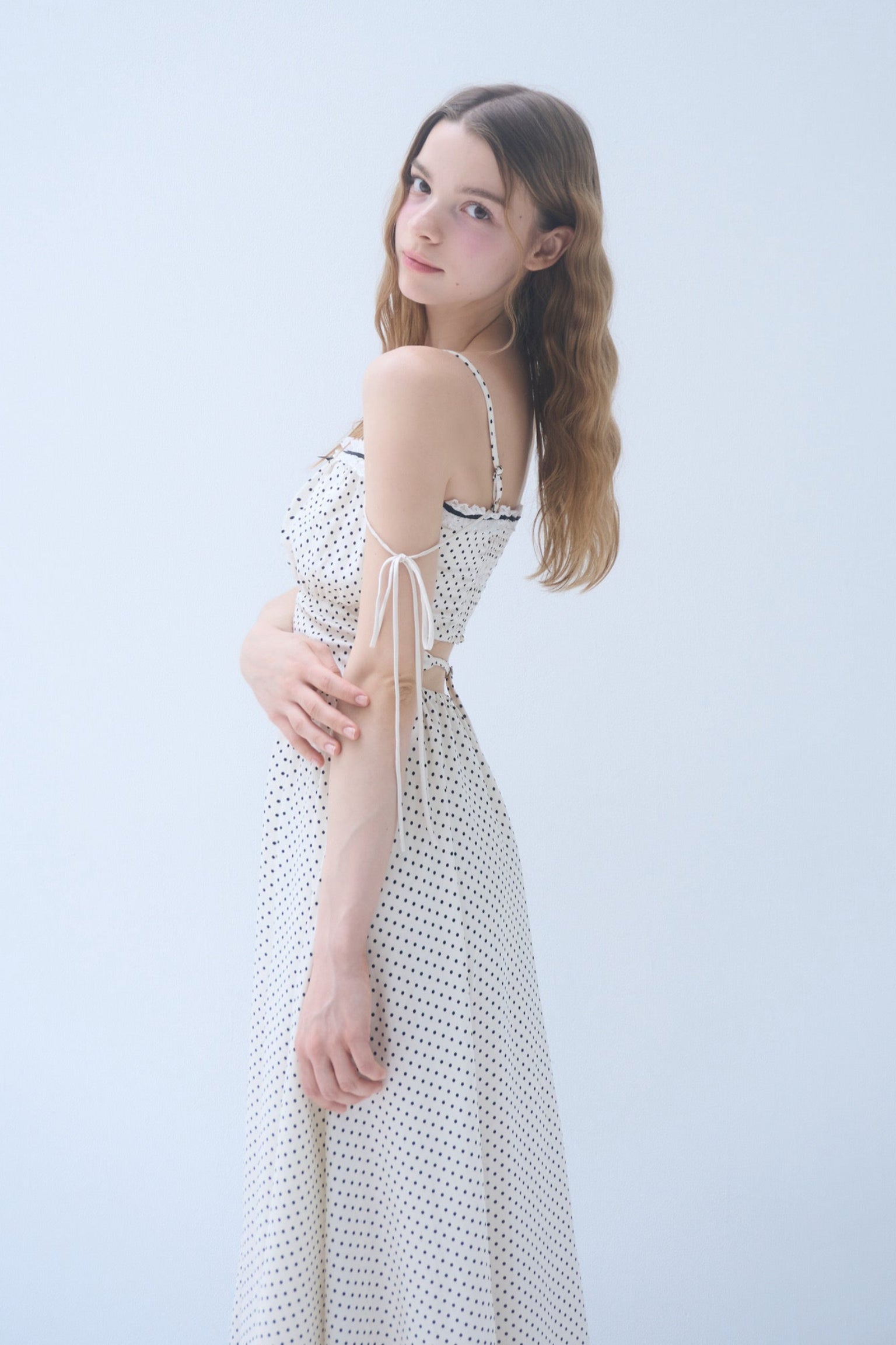 ドットの総柄と胸元のリボンが目を引く大人フレンチガーリーな印象のワンピース。