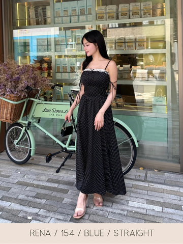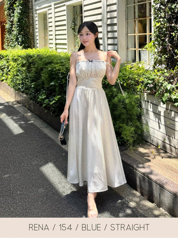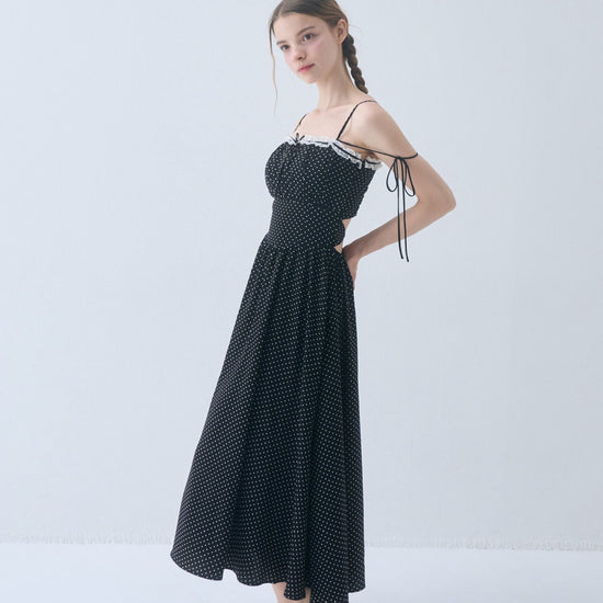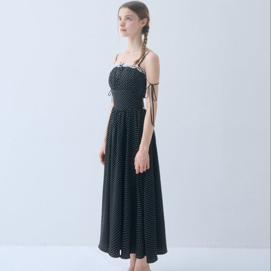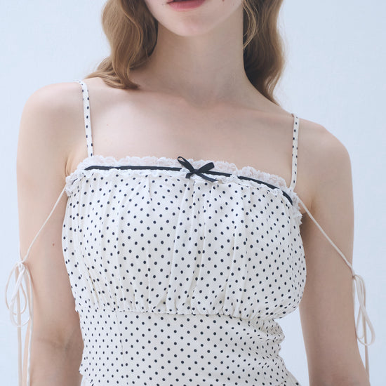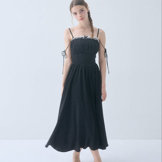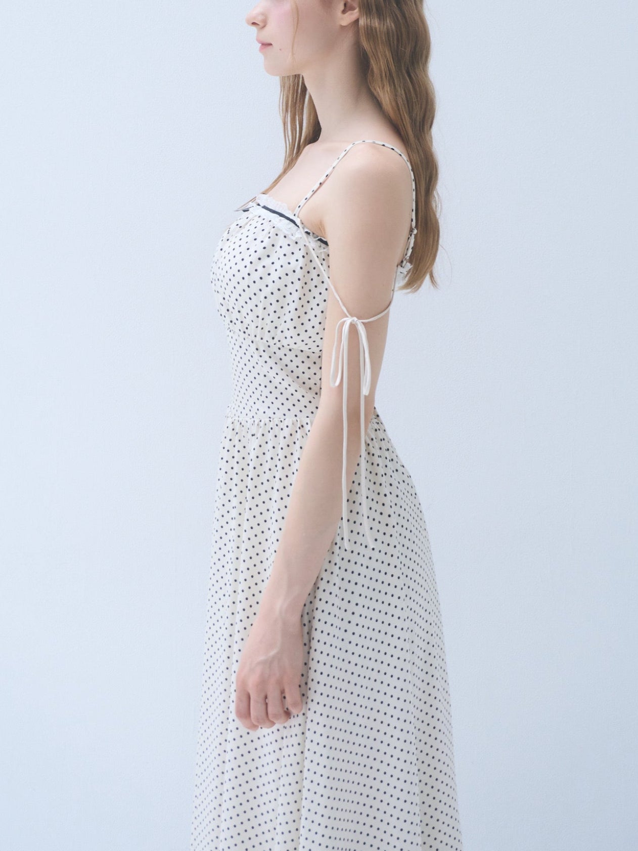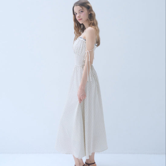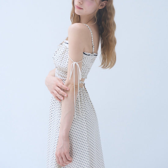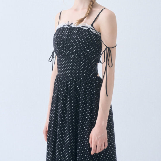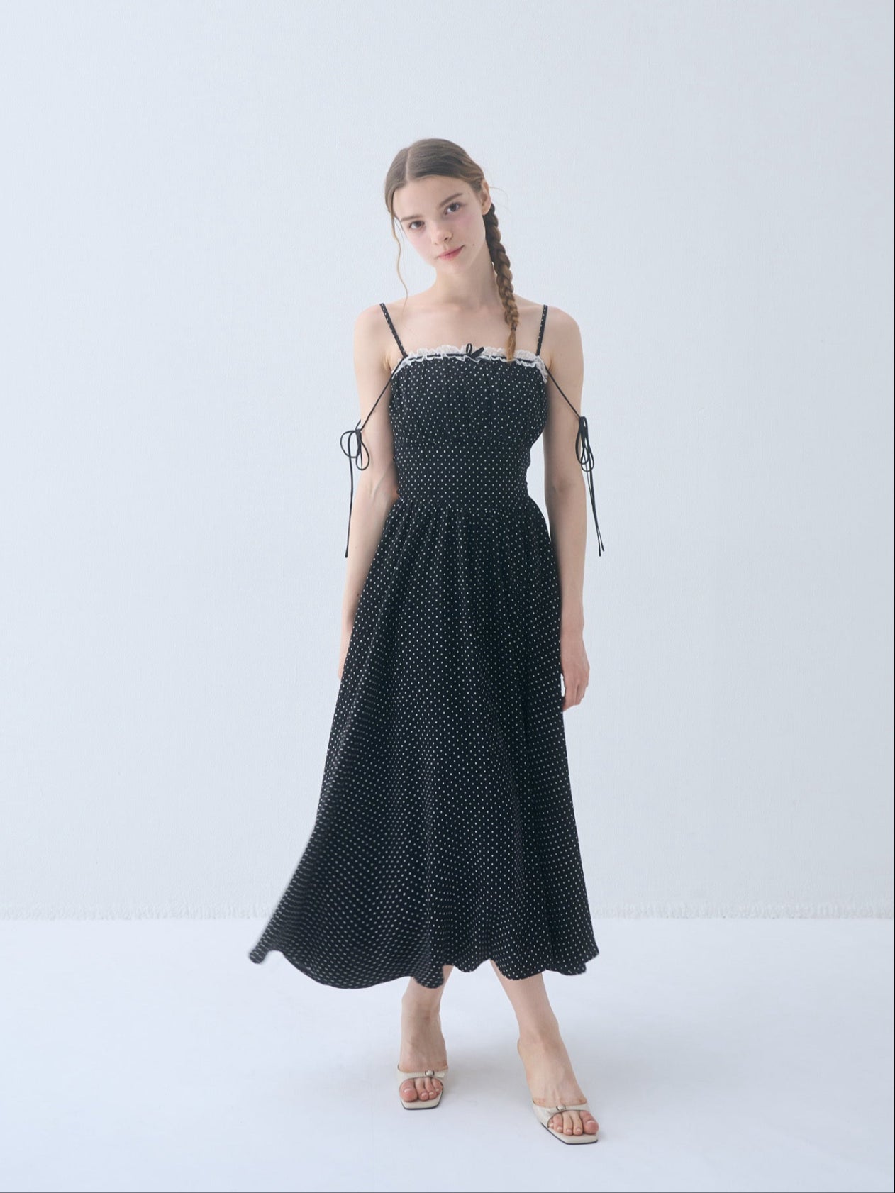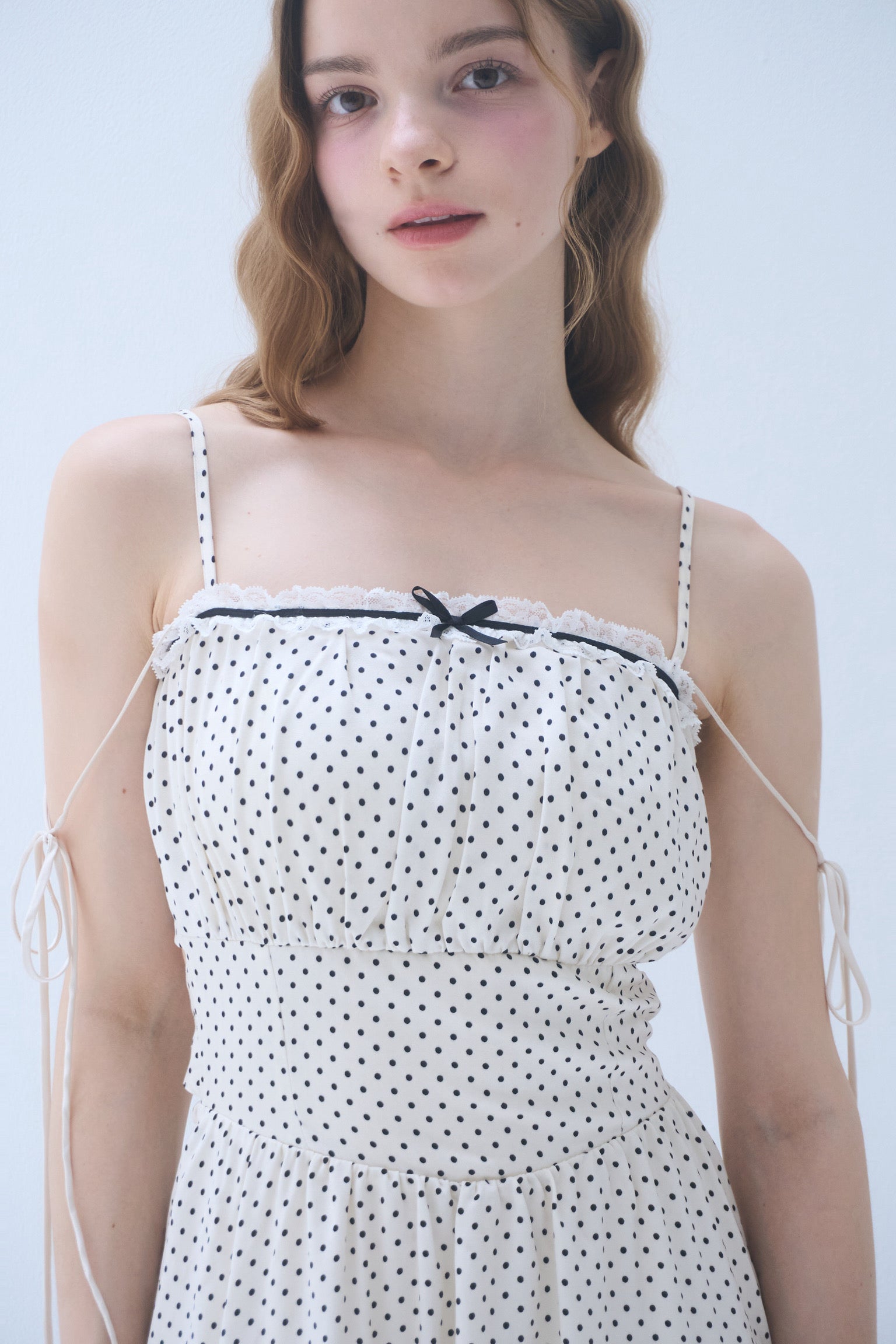 ドットの総柄と胸元のリボンが目を引く大人フレンチガーリーな印象のワンピース。