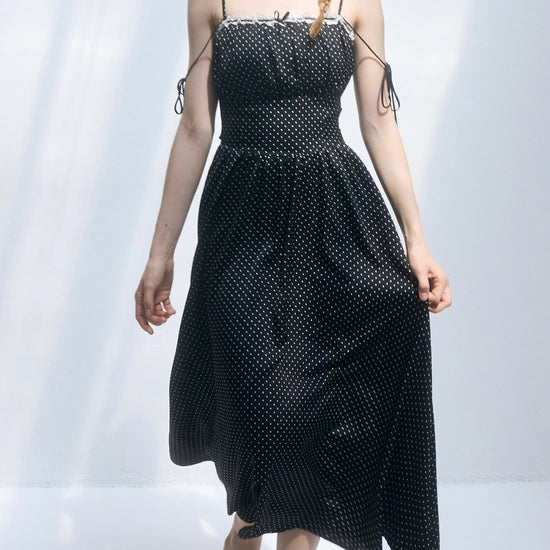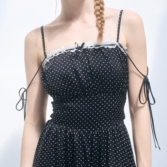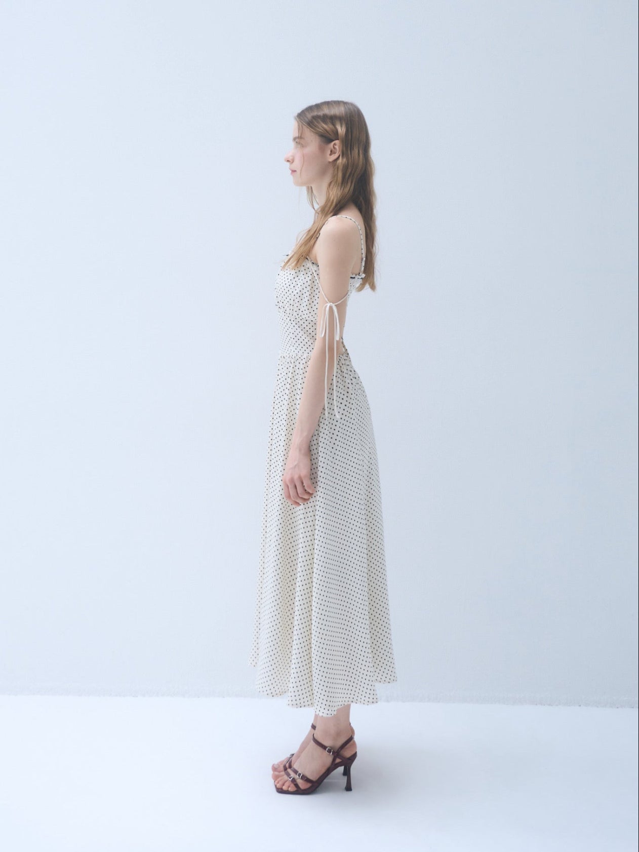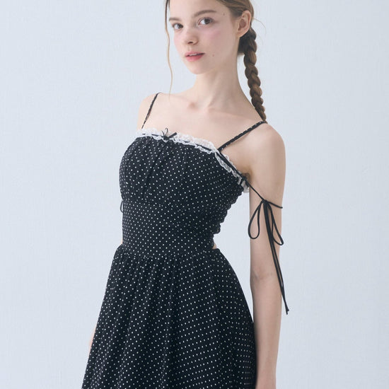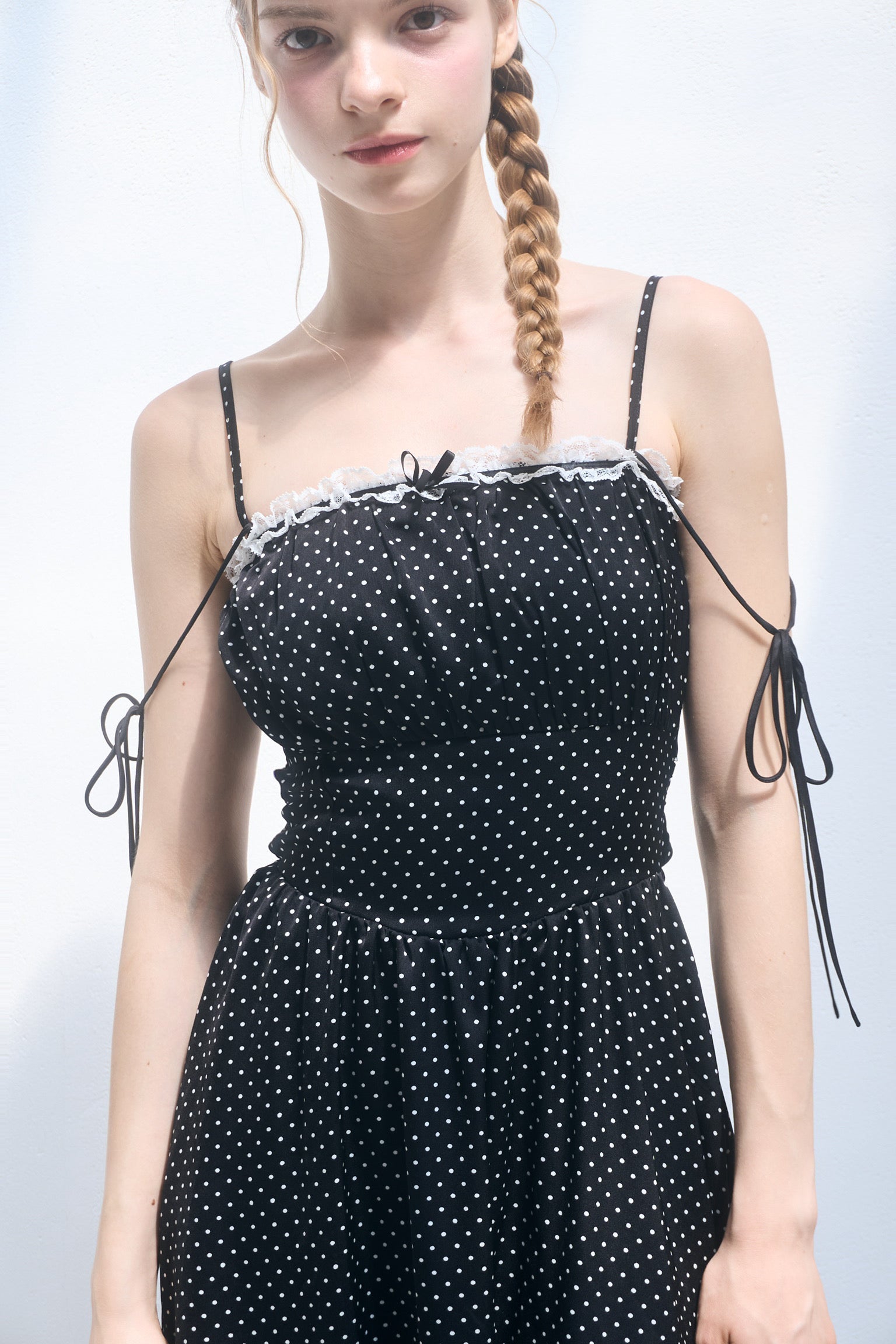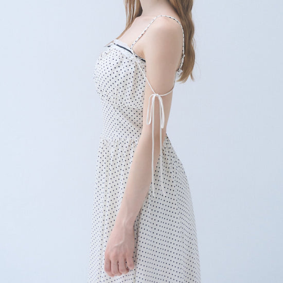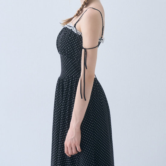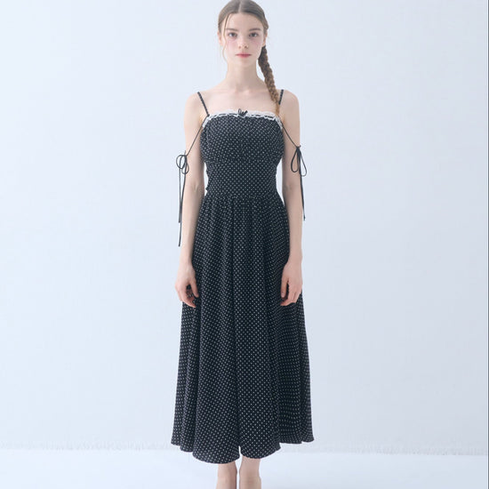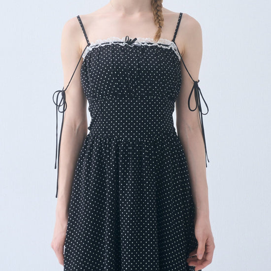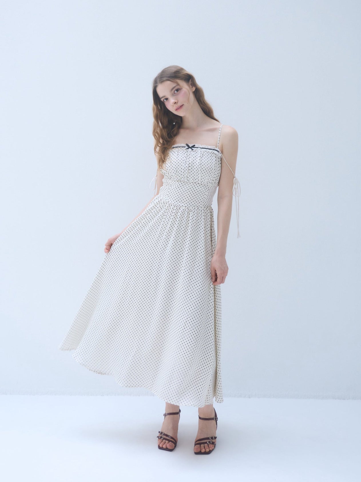 ドットの総柄と胸元のリボンが目を引く大人フレンチガーリーな印象のワンピース。
