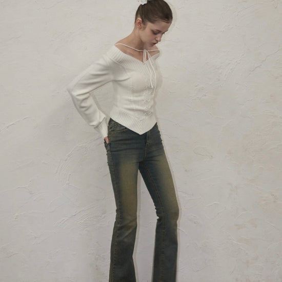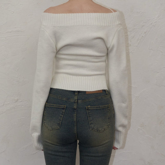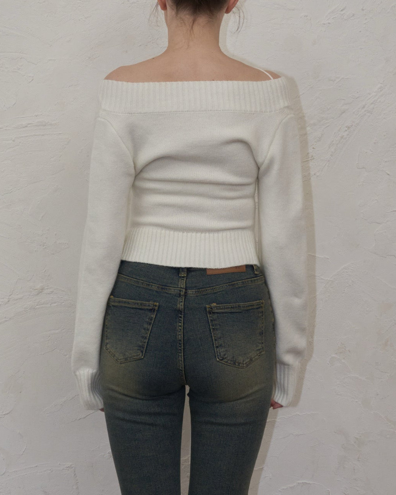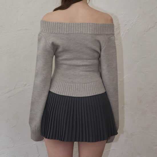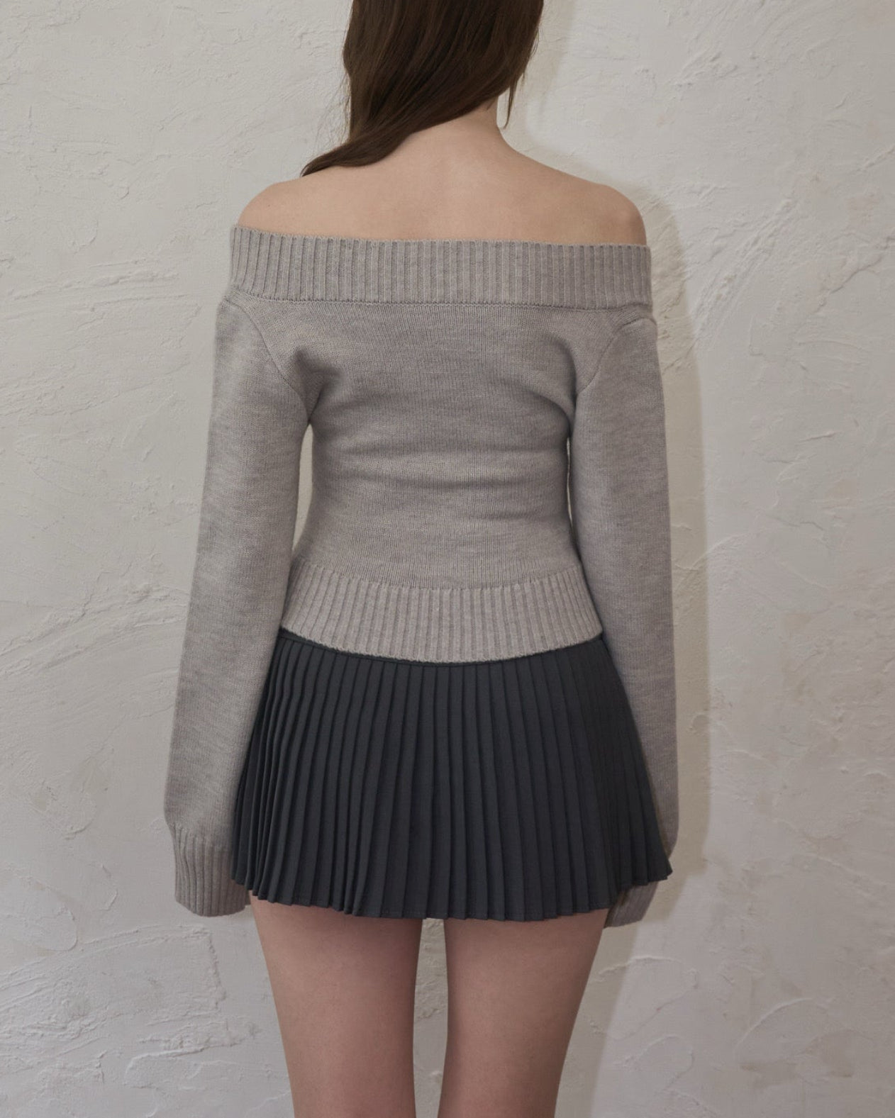 デコルテを美しく見せるVネックとしても、オフショルダーとしても着られるデザインで、シーンに合わせて印象を変えられます。