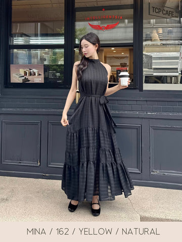 ウエストのリボンでウエストマークを作るナチュラルなシルエットのワンピース。