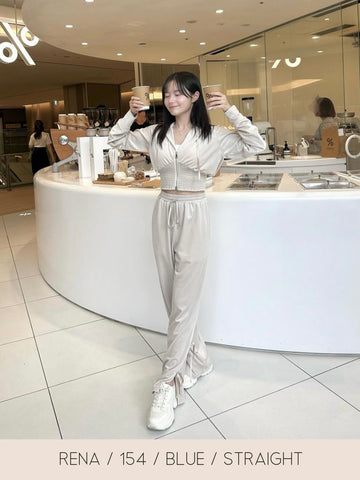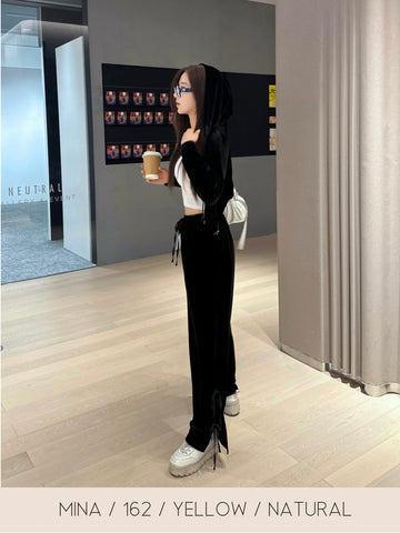 ベロア素材にサテンリボンを組み合わせて高級感あるイメージに。パーカーはコルセットデザイン。ウエストを絞ることで、YILONらしいスタイルアップを意識した女性らしい綺麗目なセットアップに仕上げました。